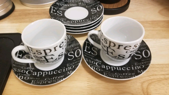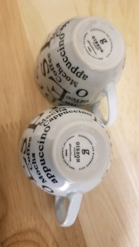 15High quality porcelain espresso cups. Gibson brand. Like new in good shape. I have other espresso cups and mugs available as well including brand new Inker Luna espresso cups in cute spotty green or orange. Price dropped from $35. Check out my other listings.