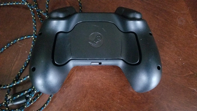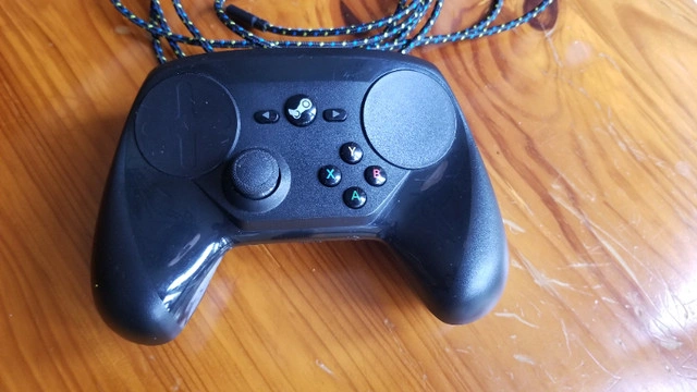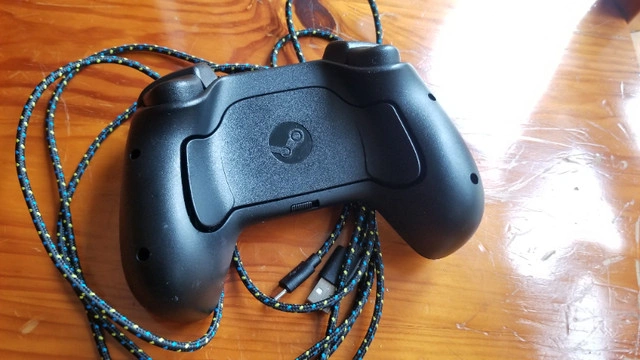 Valve Steam Controller was only made briefly and was loved by most (and hated by some) because of how different it was from conventional controllers. It was very advanced for its time and has 2 haptic feedback touch type directional pads. It also has gyroscope and accelerometer sensors enabling tilt-to-steer racing wheel functionality and other motion-controlled input which is similar to a Wii or VR controller. You can configure and use it in many different ways. I believe the goal of this was to bring PC gaming to the Couch (instead of consoles) the controller also works to control the Windows OS so you can use it as a mouse for general computer use when not gaming. Also the dual track pads were supposed to give you better control for First person shooters than a traditional gamepad. Included Wire is a very nice looking braided 3m USB Cable. The wireless dongle is missing I believe there may be a way of using a blue tooth adaptor to pair with it but I wasn't having luck with that, but didn't try too hard. Might also work with a Valve Steam Link! Works fine wired with the included long USB Cable. I think this was only available for a short time unfortunately some patent trolls stopped production and sales of the controller. Tons of buttons, and sensors, and innovation in this thing, it's a shame. "Dual-stage triggers, each with 10° of travel, a magnetic flux sensor, and a tactile switch" All the buttons have a good quality feel with tactile feedback. Not only does it have the now 'usual' top two layers of triggers but it also has 2 additional back triggers intelligently built into the battery holder cover area.