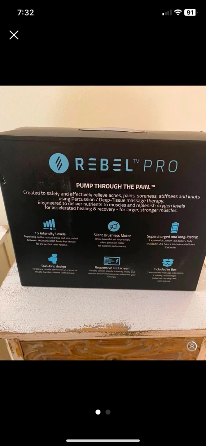 Selling a brand new Rebel Pro massage gun, still in its original box! It's designed to relieve aches, soreness, stiffness, and knots through percussion and deep-tissue massage therapy.