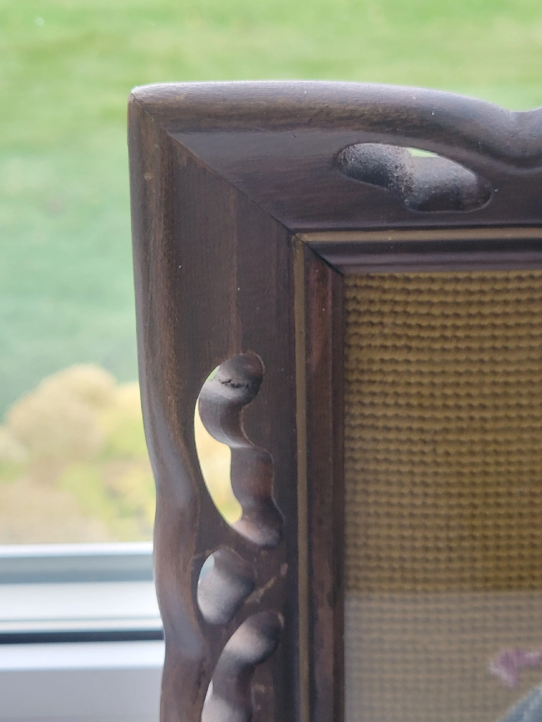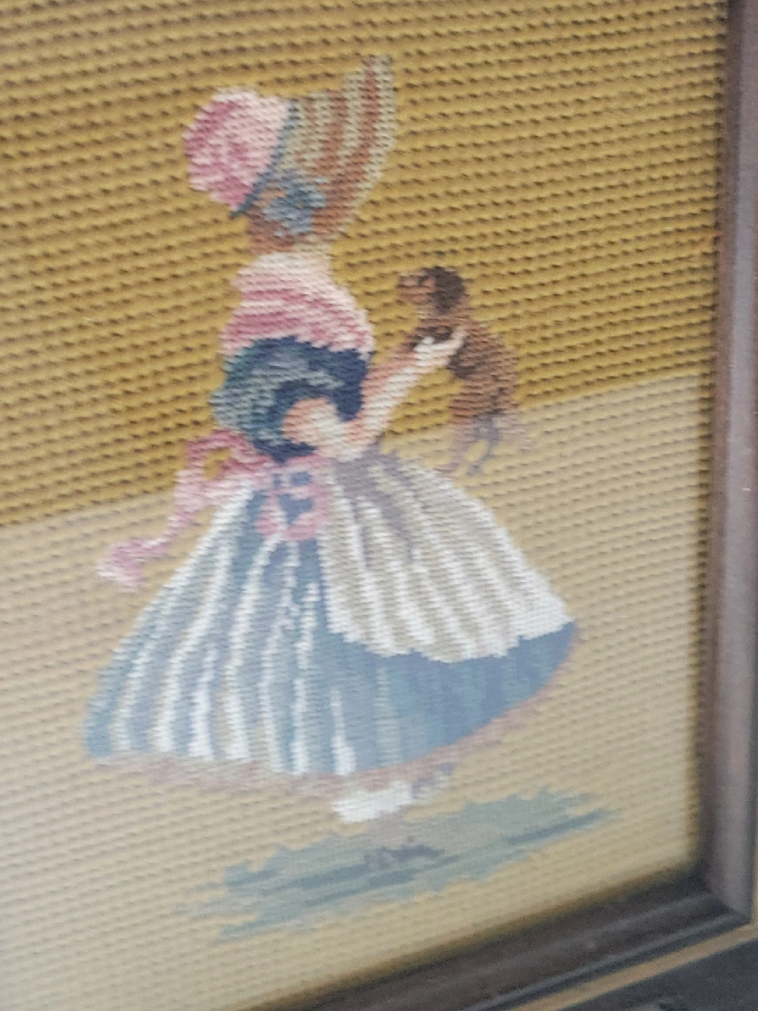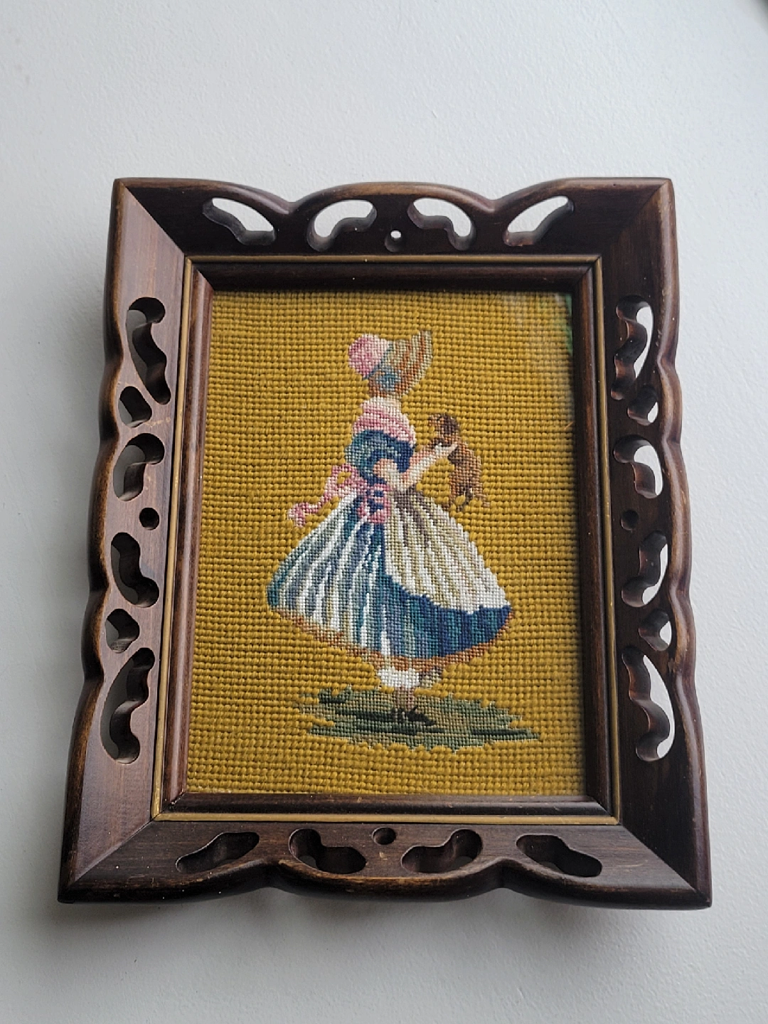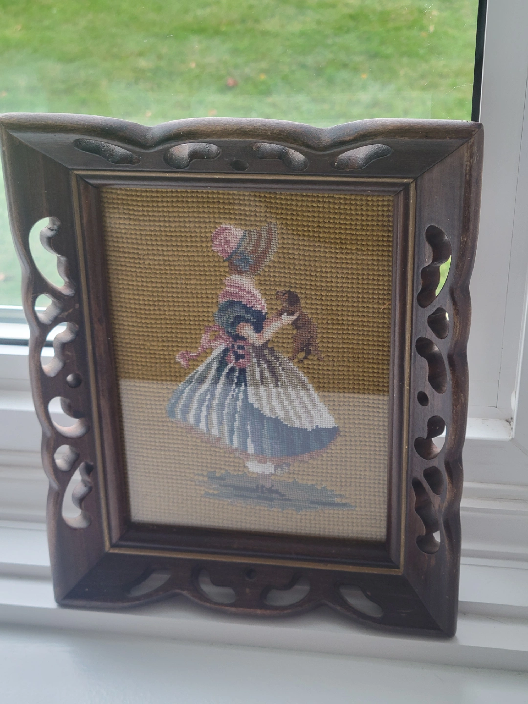 103Needlepoint picture of a girl holding a dog, framed with a dark wood frame Glass, Hanger on back approx 8" x 10" $20 Firm please click on my many ads for sale Fennell and Upper gage Hamilton