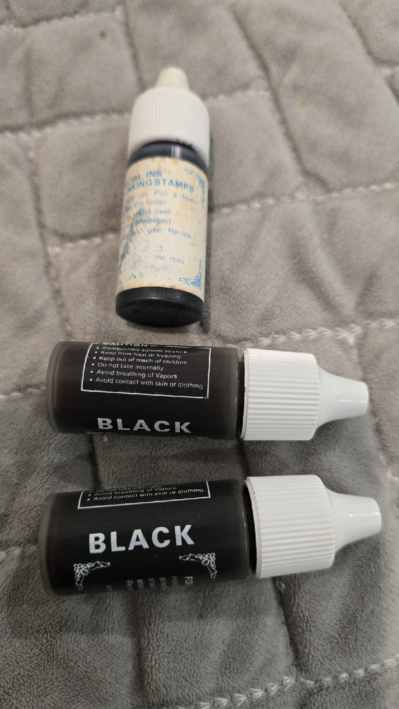 I have some black stamp ink. There are three bottles in total. Please note the caution warnings on the bottles, such as avoiding contact with skin or clothing.