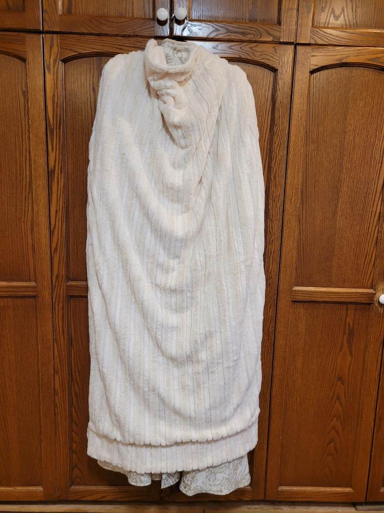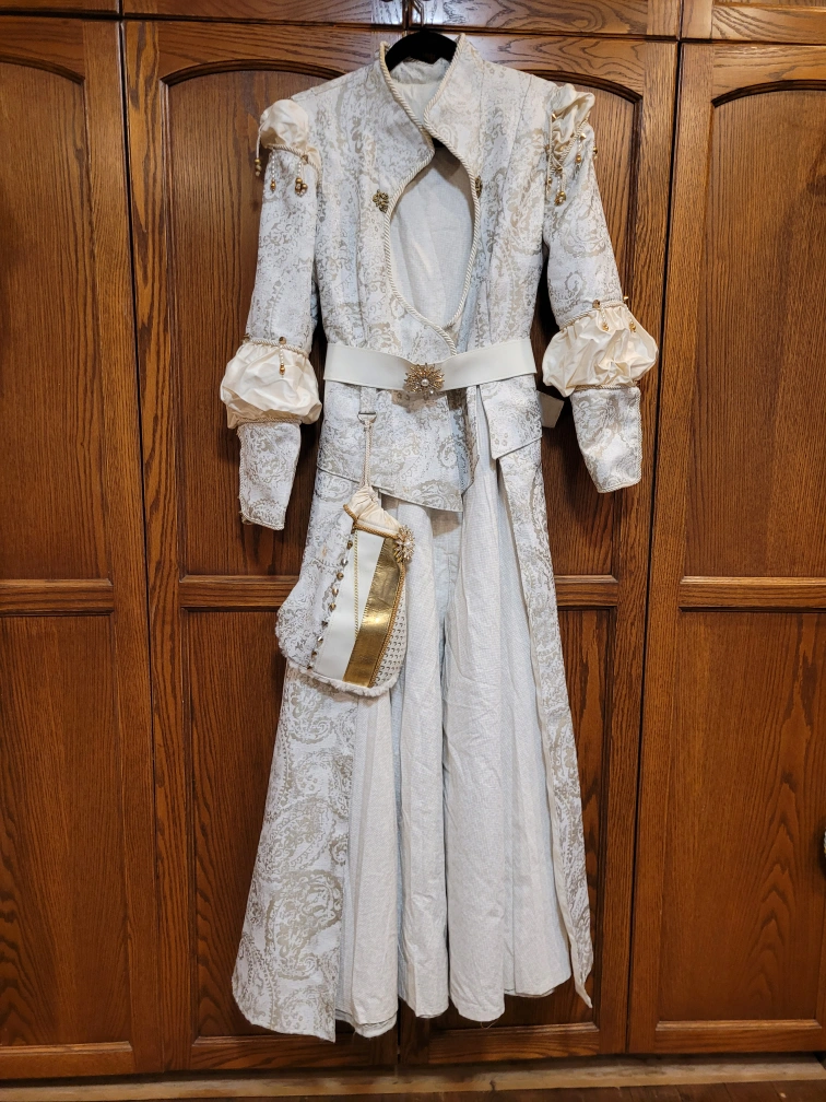70Made for my daughters mid-evil wedding. I will never wear this again. It would make a fantastic Halloween or cosplay costume. Includes a jacket, belt, headpiece, and a cozy fur coat! The jacket is a beautiful white and gold patterned design. Also includes a matching belt and a unique headpiece. To top it off, there's a comfy fur coat to keep you warm. Perfect for cosplay or themed events!