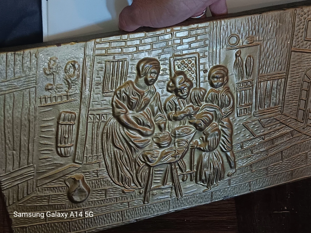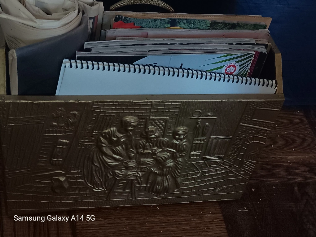 Selling a vintage embossed metal magazine box . It has a unique design featuring a scene with figures. Perfect for storing books or other items! 437-870-6281