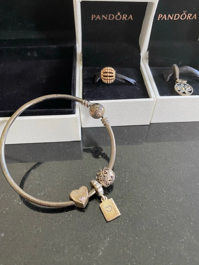 Pandora bracelet with 4 charms - including packaging as in the pictures ‘Sister’ heart charm $50 new ‘Family tree’ charm $95 new ‘Happy Birthday’ dangling charm - $65 new Rose gold bead charm - $55 new Silver bead charm - letter ‘O’ - $40 new Pandora moments bangle -$85 new Immaculate condition- hardly worn Make an offer for all - new price over $300+ tax Pickup can be arranged in Brampton, Mississauga, Oakville, Burlington, Hamilton