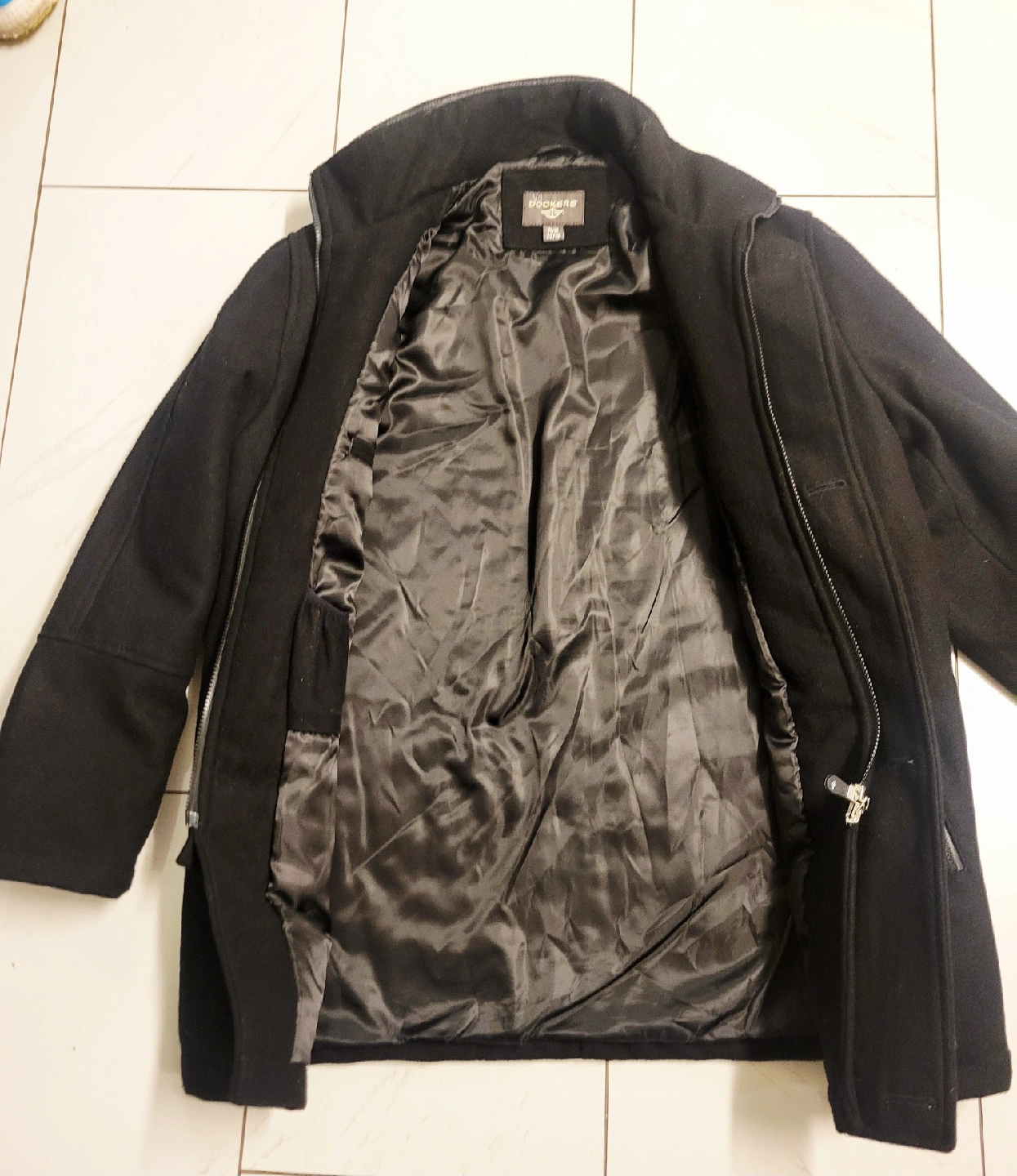 Dockers black wool blend jacket in great condition! It has a zipper and button closure, plus zippered pockets. Perfect for fall weather