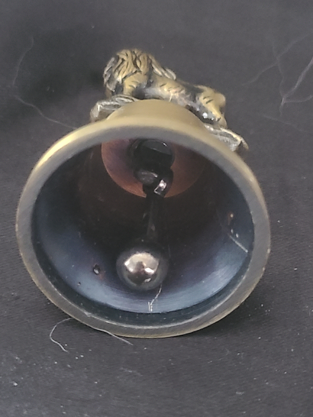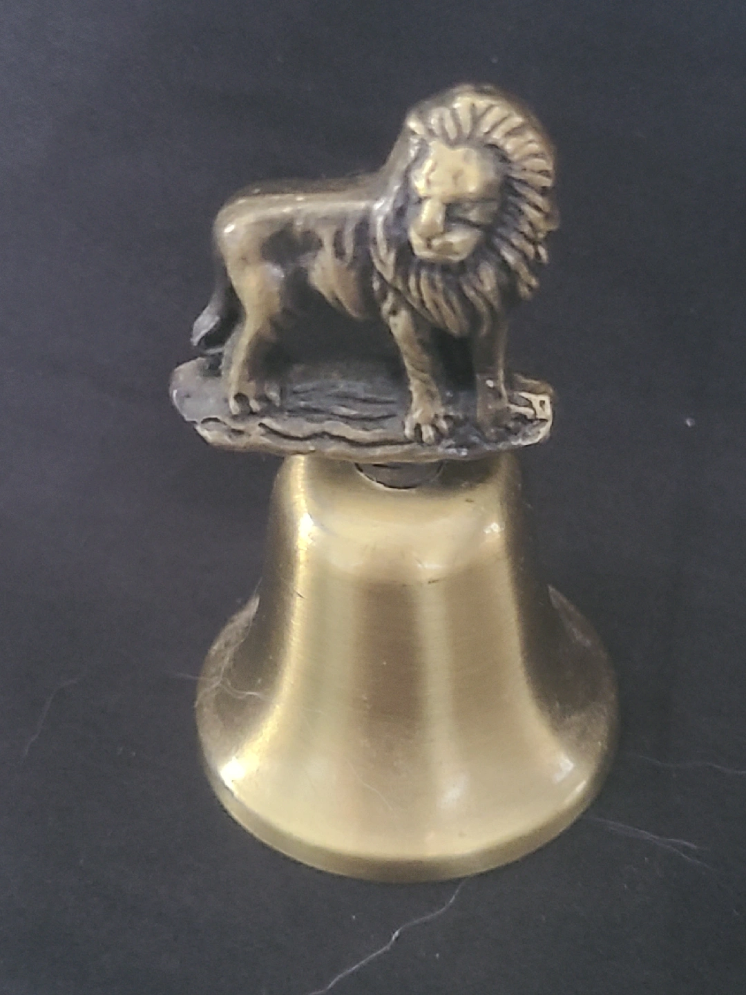 This is a charming brass bell featuring a lion figure on top. It's in good condition and would make a lovely addition to any collection or a unique decorative piece