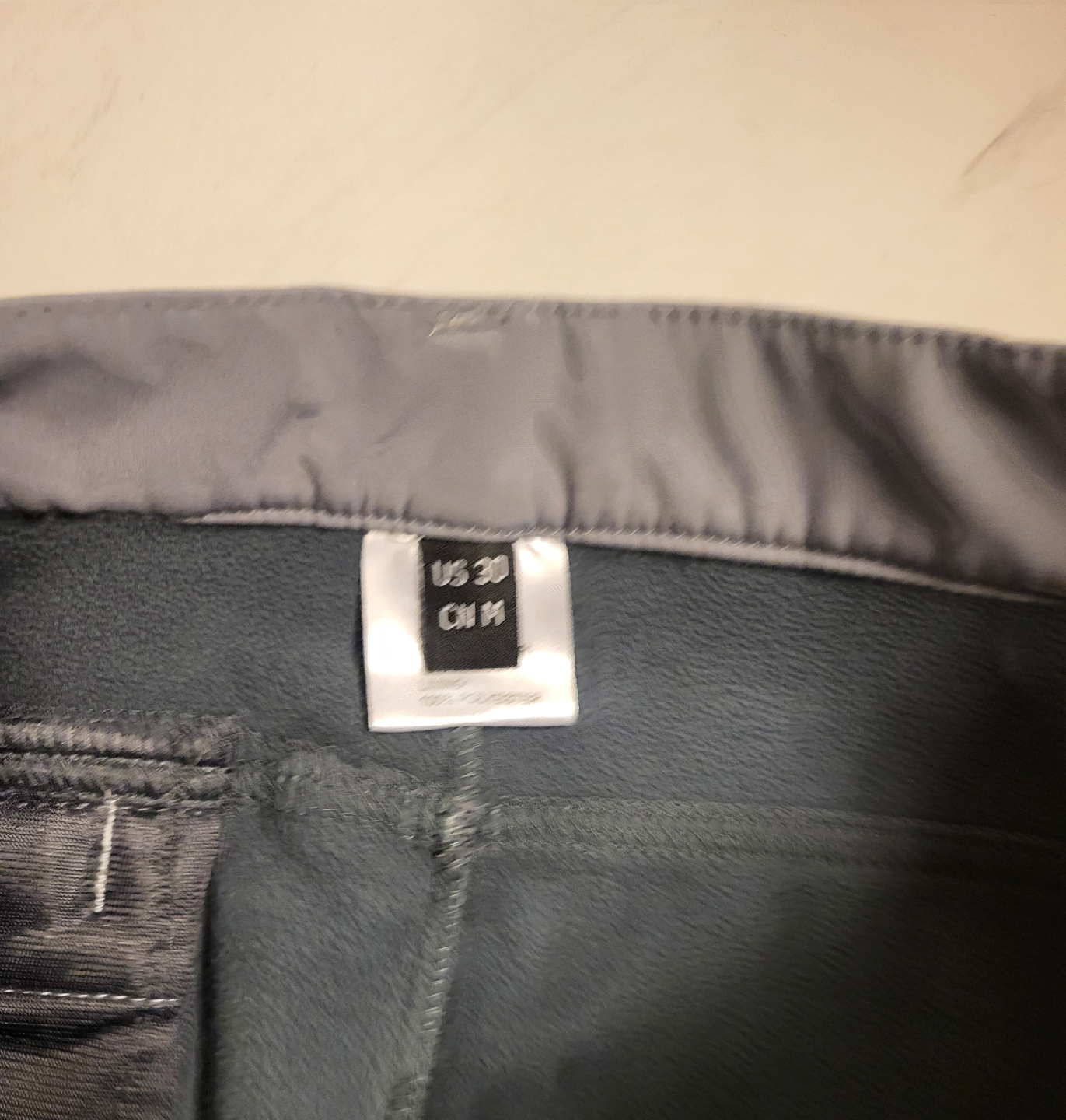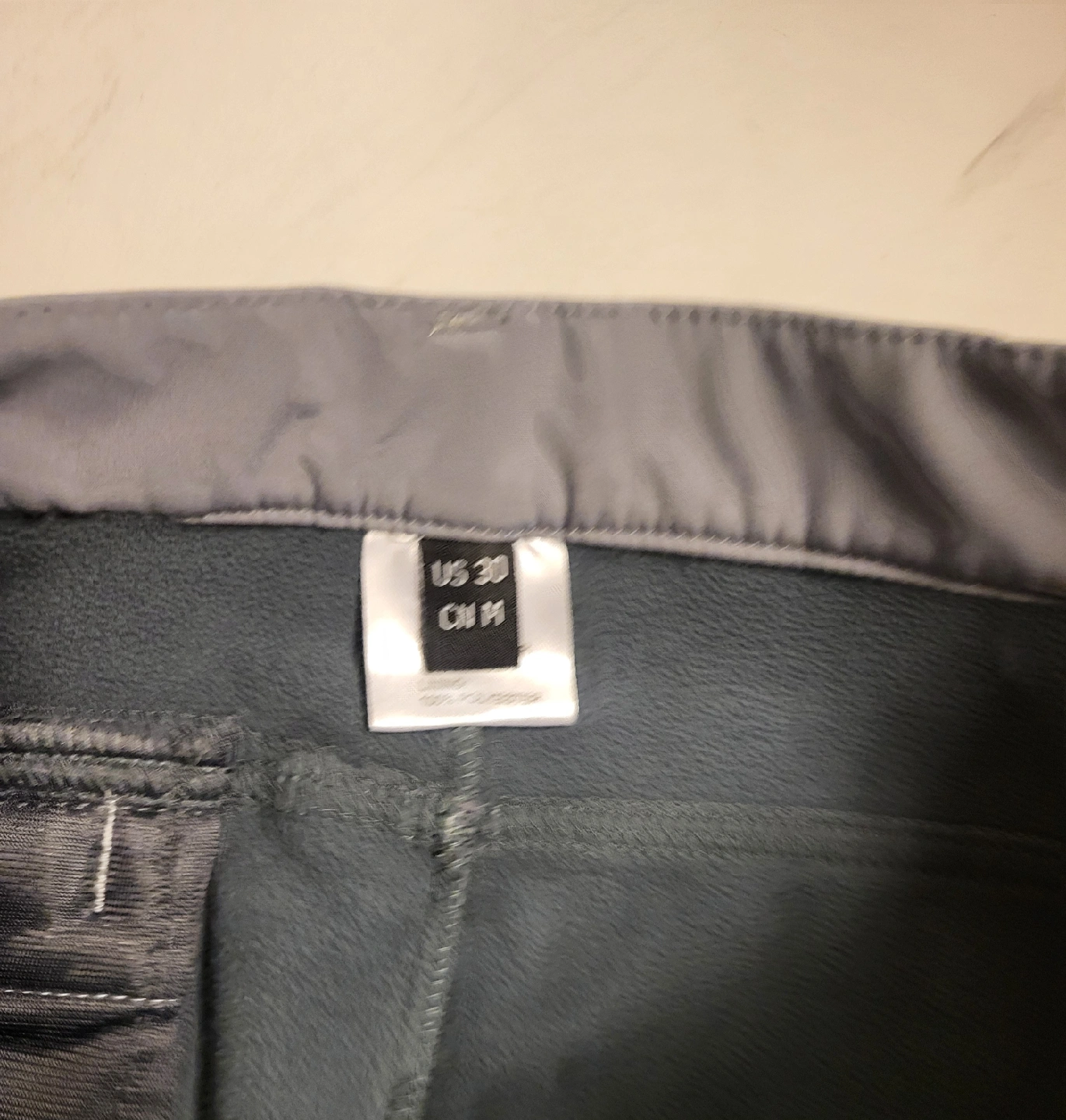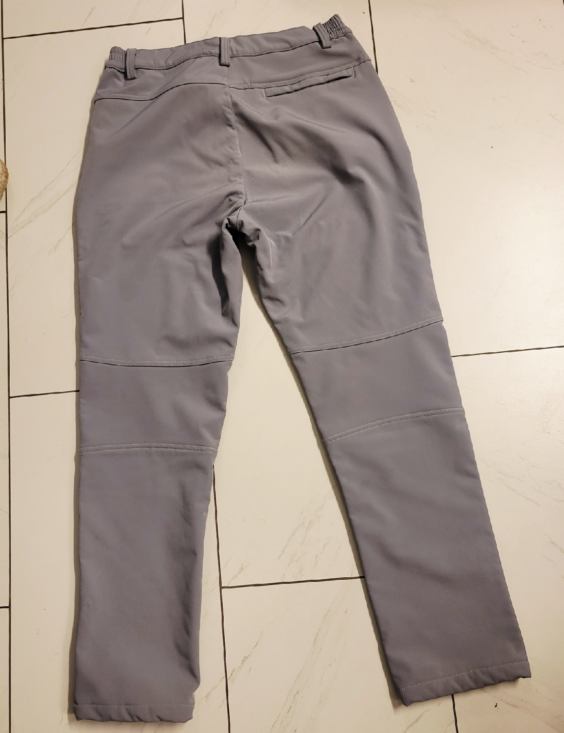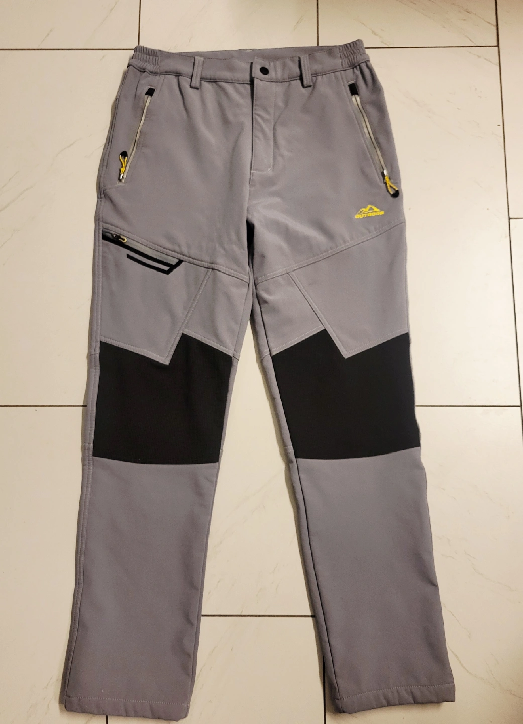 These hiking pants are in great shape! They're a stylish gray and black colour, perfect for outdoor adventures. The size is US 30, so they'll fit comfortably. They have a logo that says 'Outdoors'.
