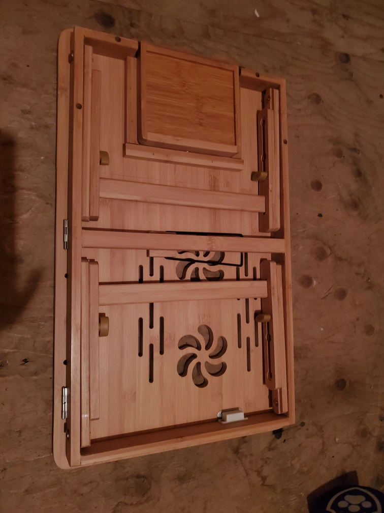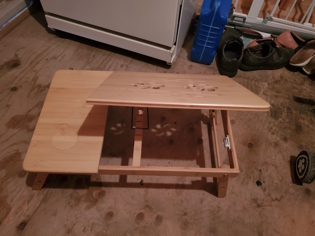 96Selling a handy bamboo laptop desk that's perfect for using in bed or on the couch! It's in great shape and folds up for easy storage. The design includes ventilation holes to keep your laptop cool. Great for working or relaxing!