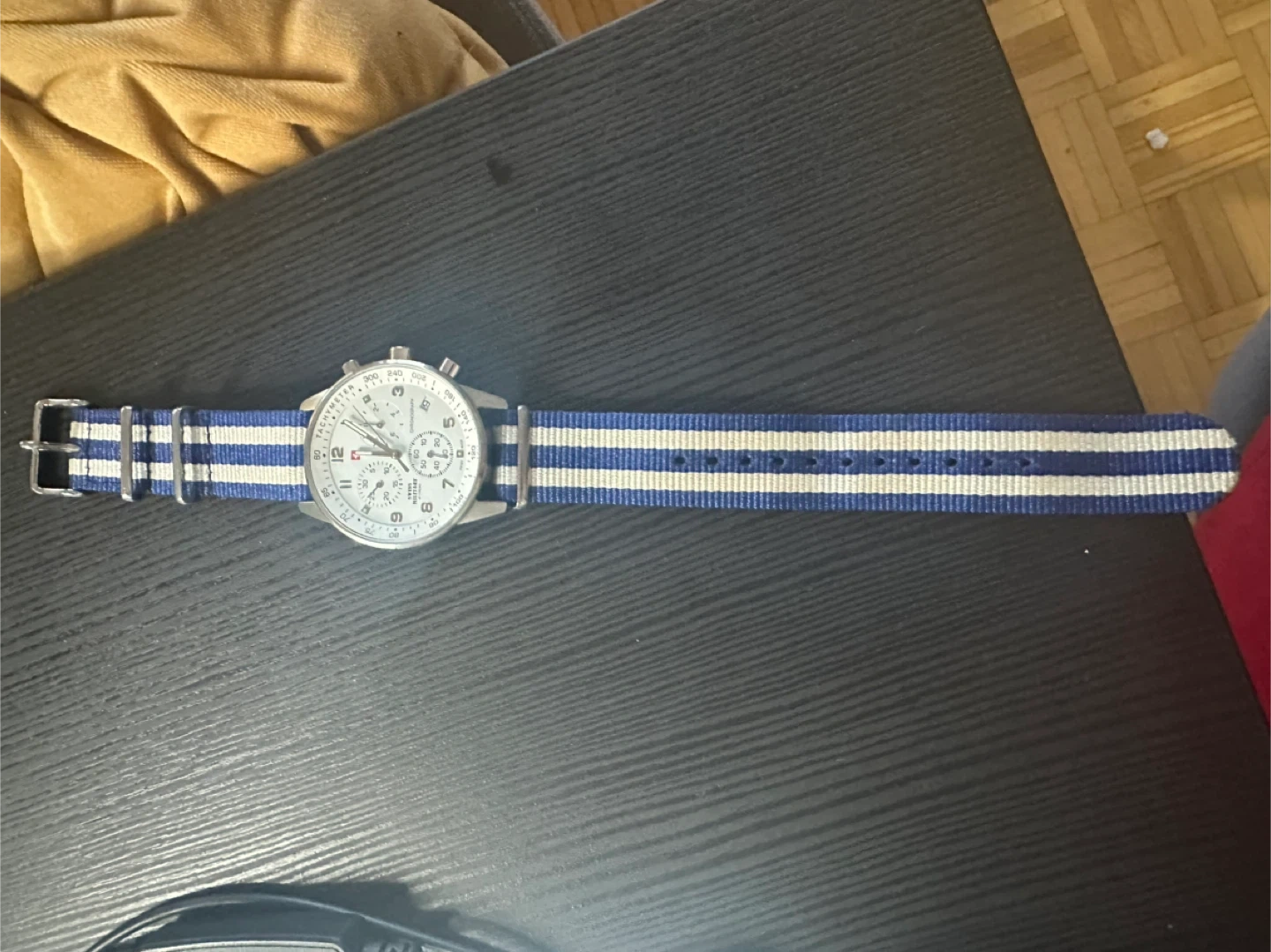 Selling a Wenger Swiss Military watch. It has a nice white face and a blue and white striped strap. It's in great shape and ready for a new owner!