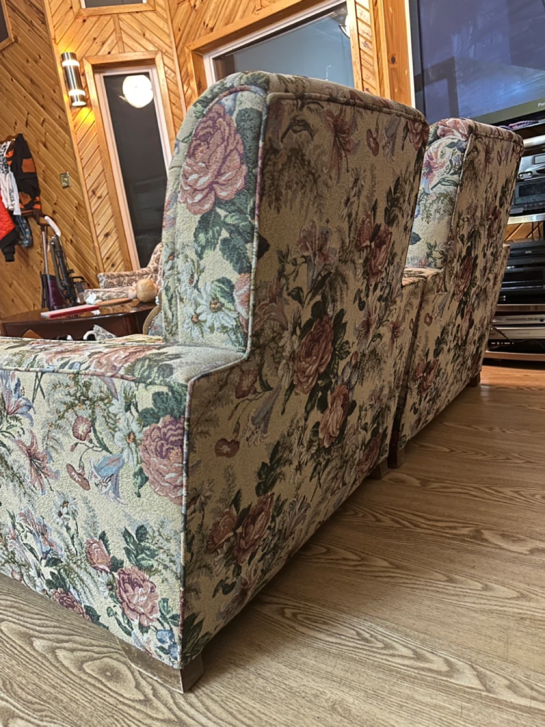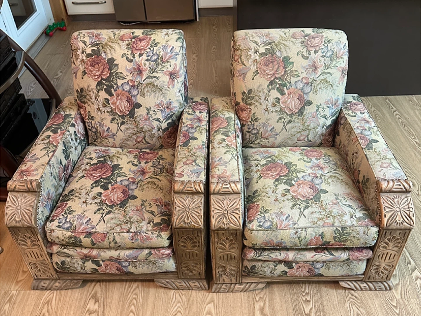 Selling a pair of vintage spanish revival style armchairs featuring elegant carved wood detailing and classic floral upholstery that. These chairs offer both comfort and timeless style, perfect for a living room, or vintage-inspired décor.