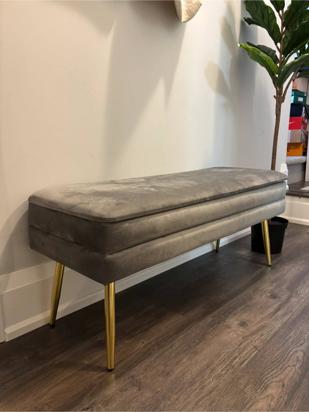 Selling a grey velvet storage bench. It shows some signs of use, as seen in the photos. Perfect for adding extra seating and storage to any room!