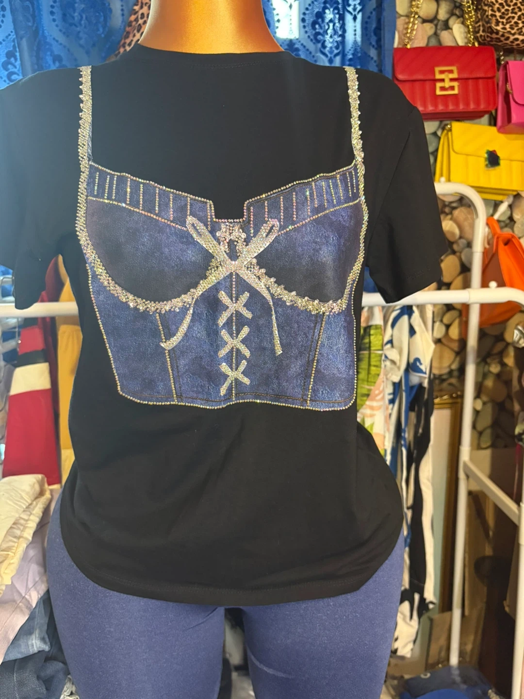 Cute black t-shirt with a rhinestone corset design! It's in great condition and ready for a new home