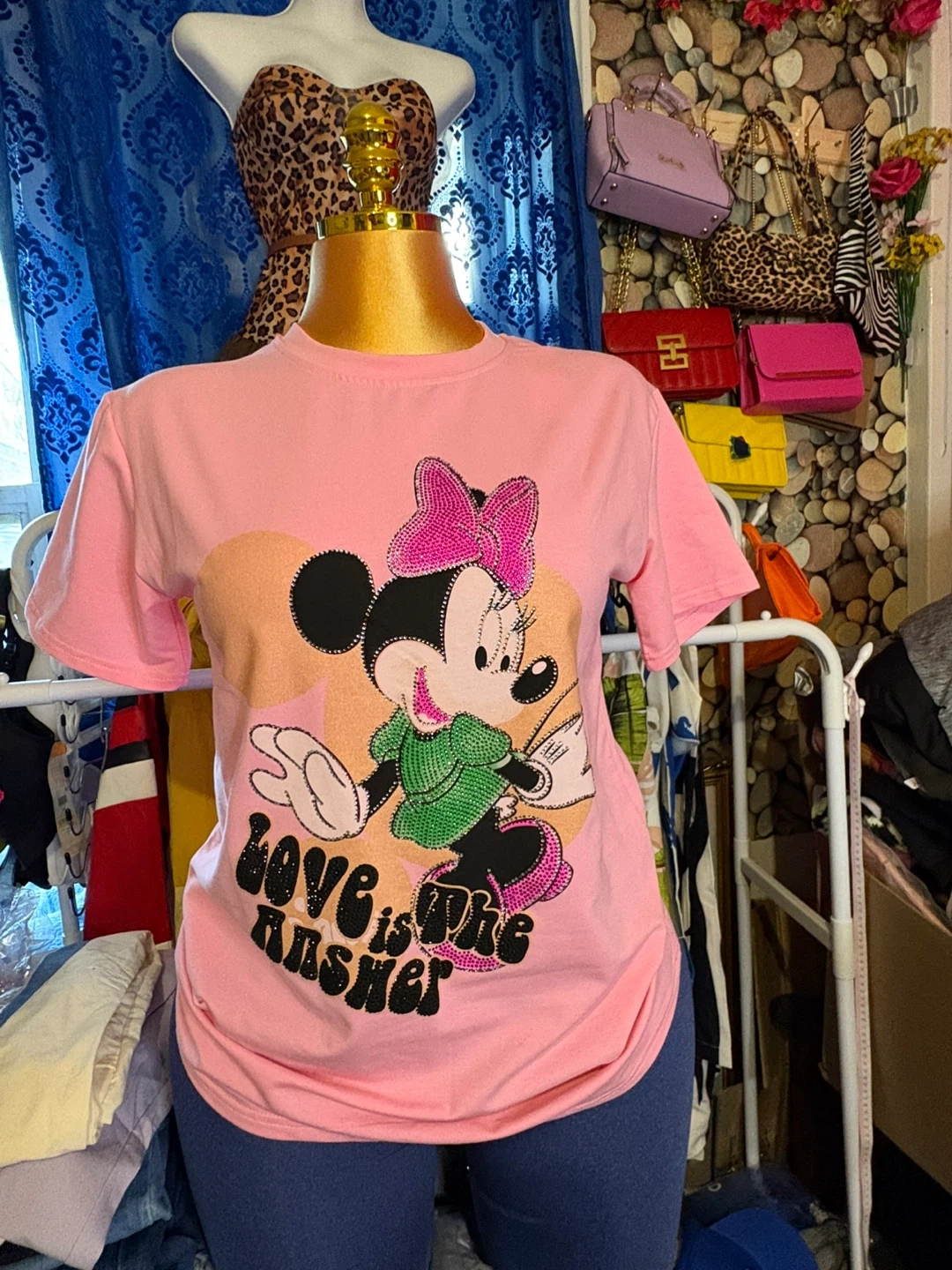 153Cute pink t-shirt featuring Minnie Mouse with the phrase 'Love is the Answer' in a fun, sparkly design! Perfect for any Disney fan