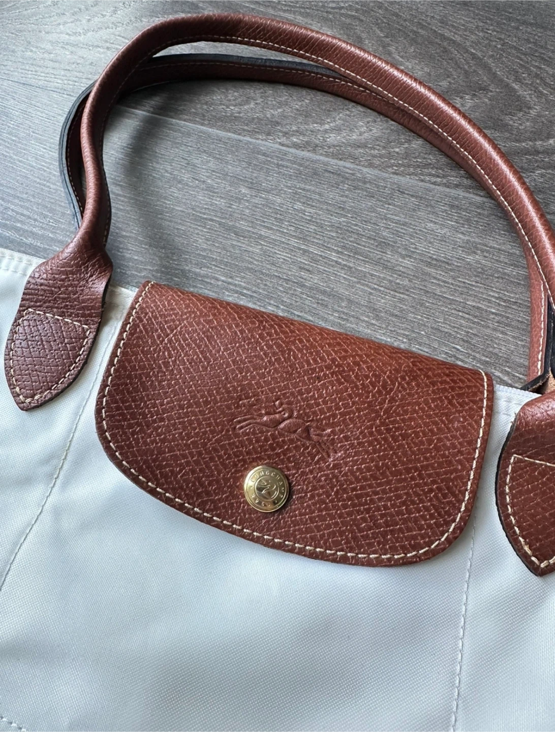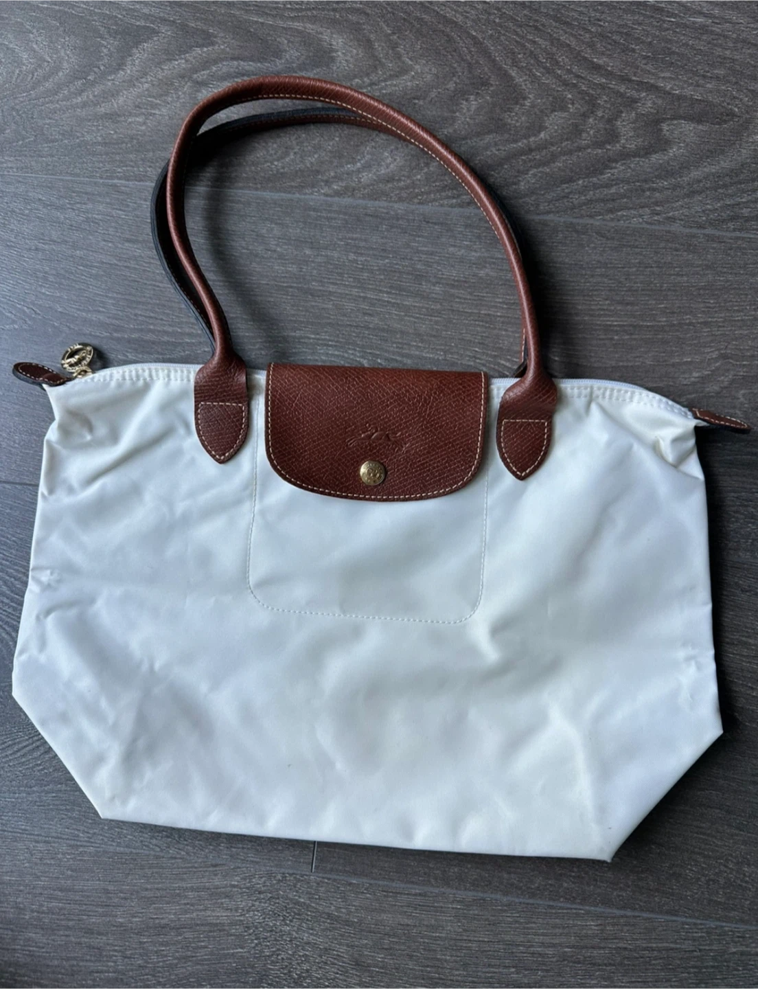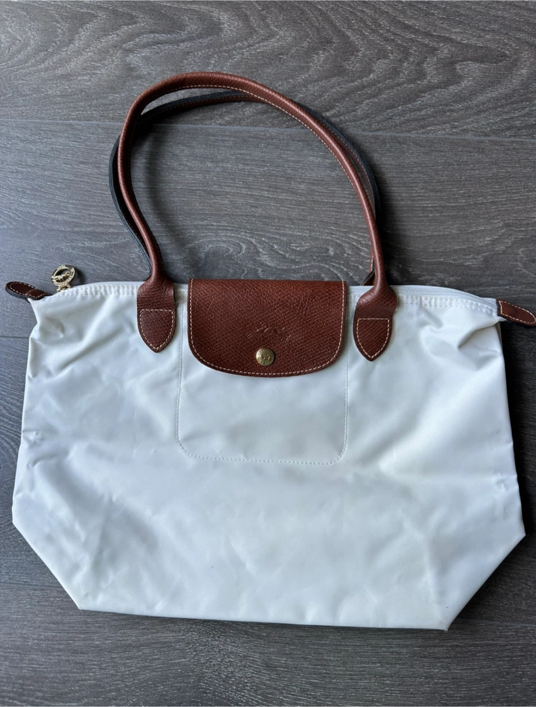 The bag features a white body with brown leather accents on the handles and flap. It's lightweight and spacious, making it a great choice for carrying your essentials around town