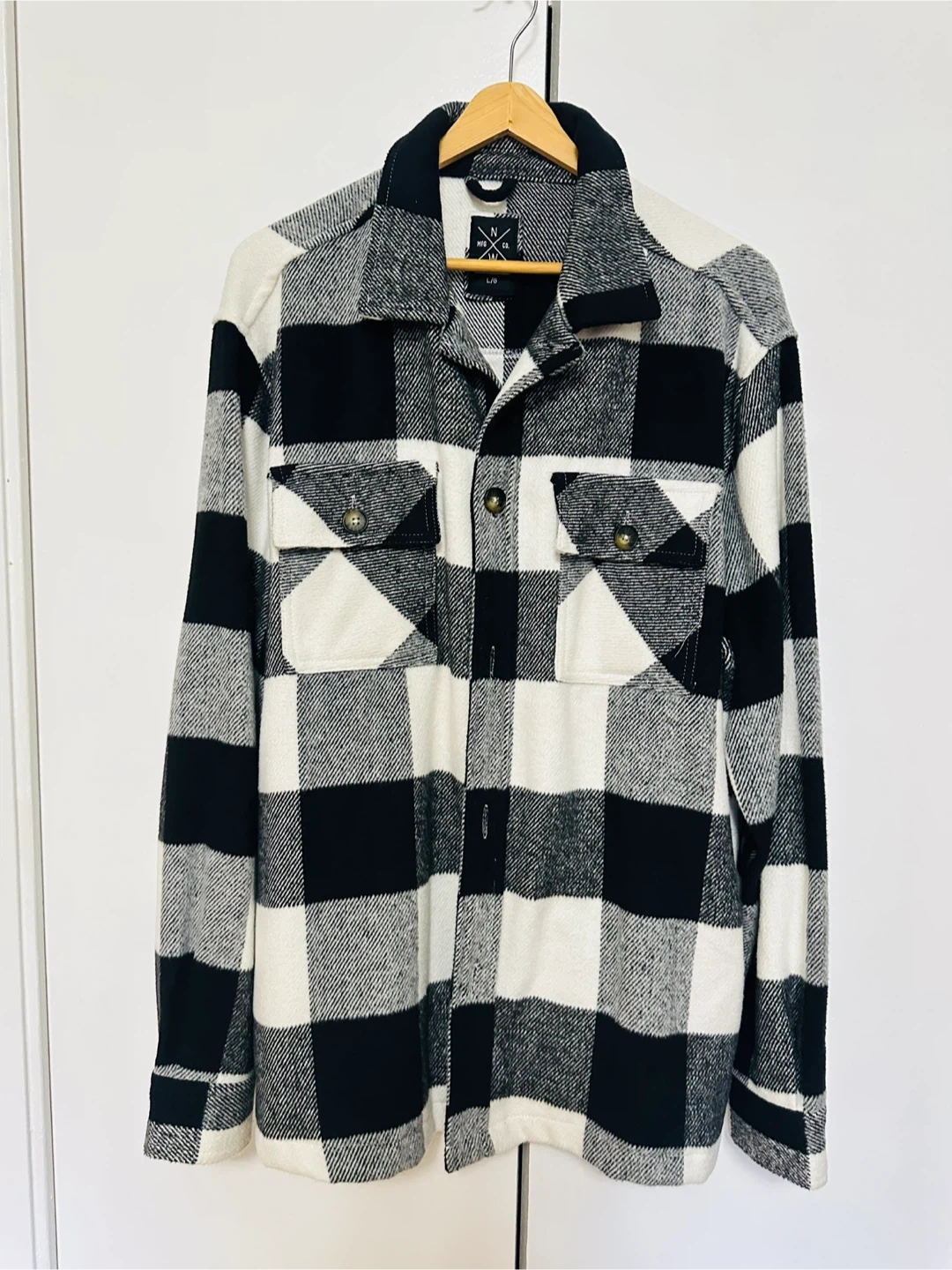 Here's a cozy flannel shirt from N MFG CO! It features a classic black and white checkered pattern. It's a size L/G and would be a great addition to your wardrobe for those cooler days