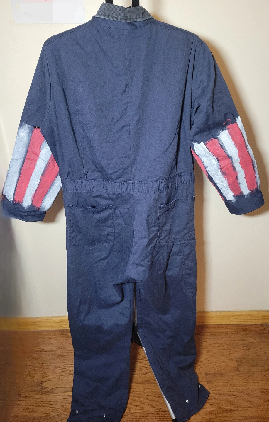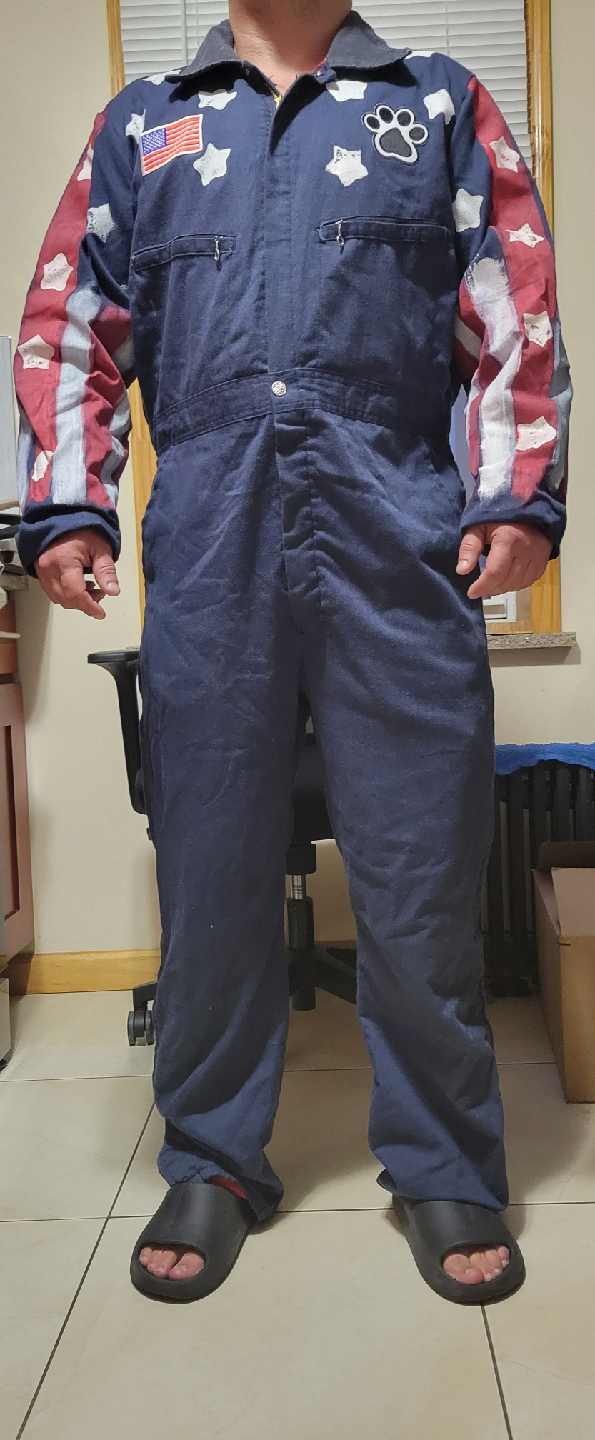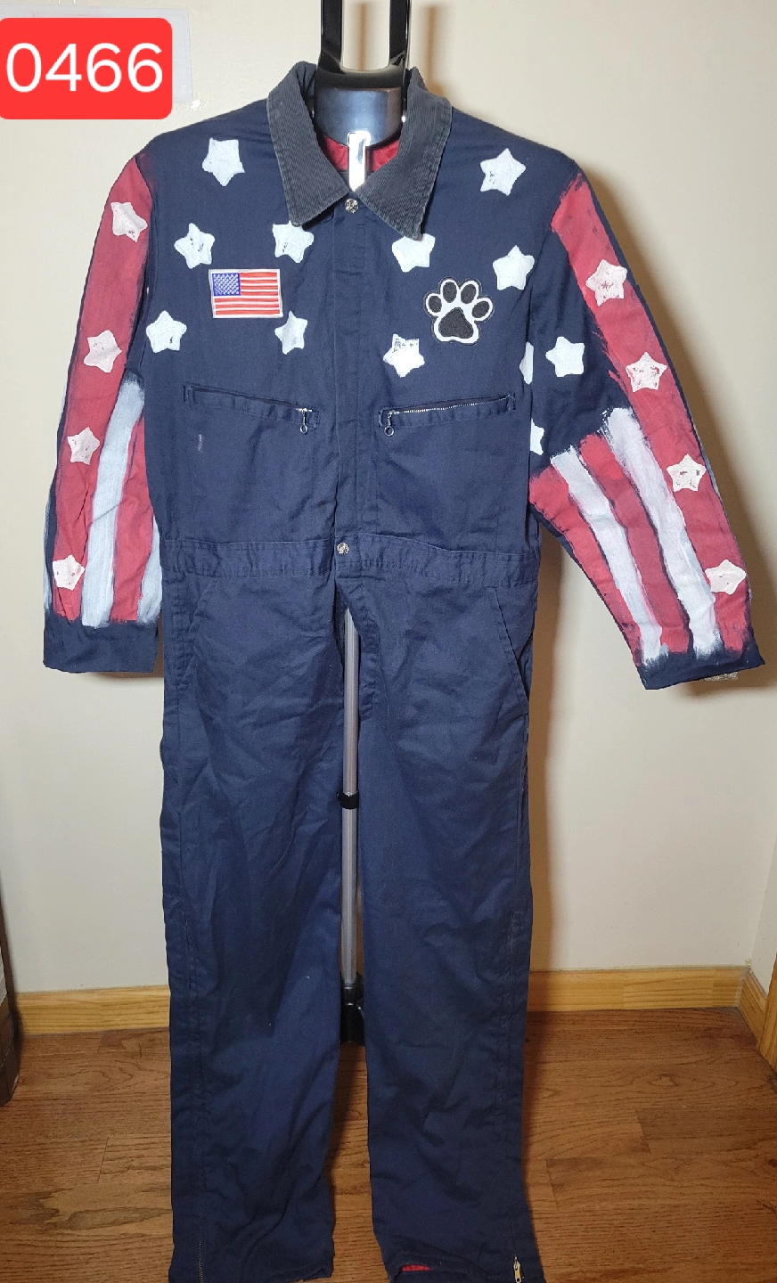 Selling a patriotic coverall jumpsuit! It is a size medium and is navy blue with a corduroy collar. It has an American flag patch on the front and a paw print design. The sleeves are painted with red and white stripes and stars. It's a fun and unique piece!