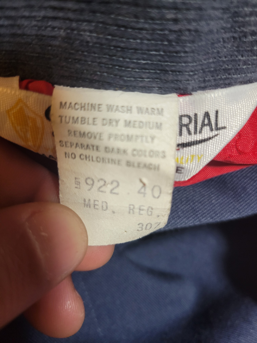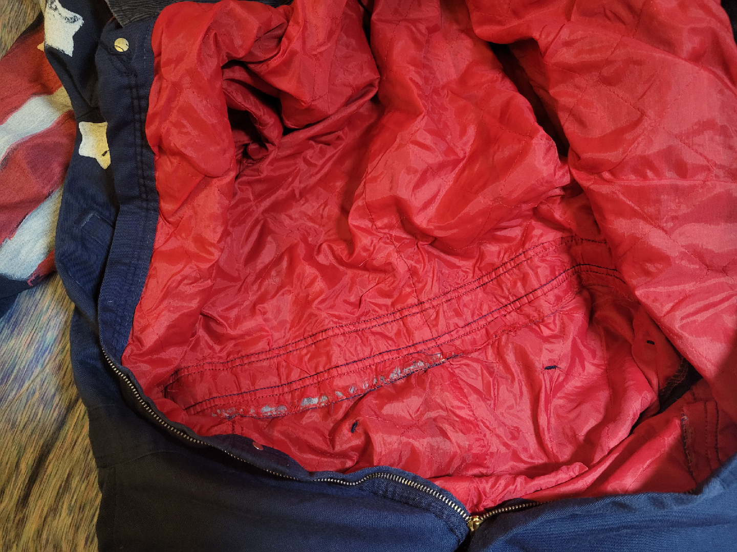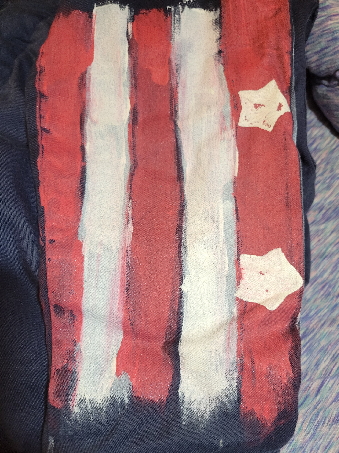 Selling a patriotic coverall jumpsuit! It is a size medium and is navy blue with a corduroy collar. It has an American flag patch on the front and a paw print design. The sleeves are painted with red and white stripes and stars. It's a fun and unique piece!