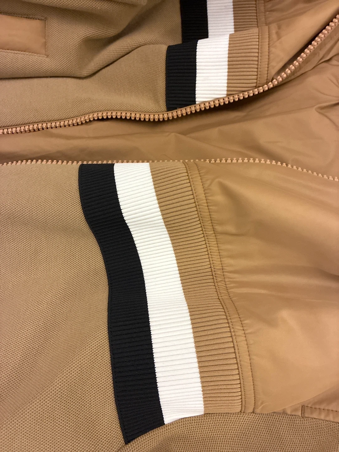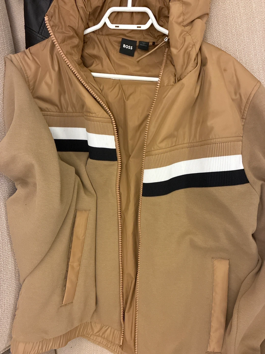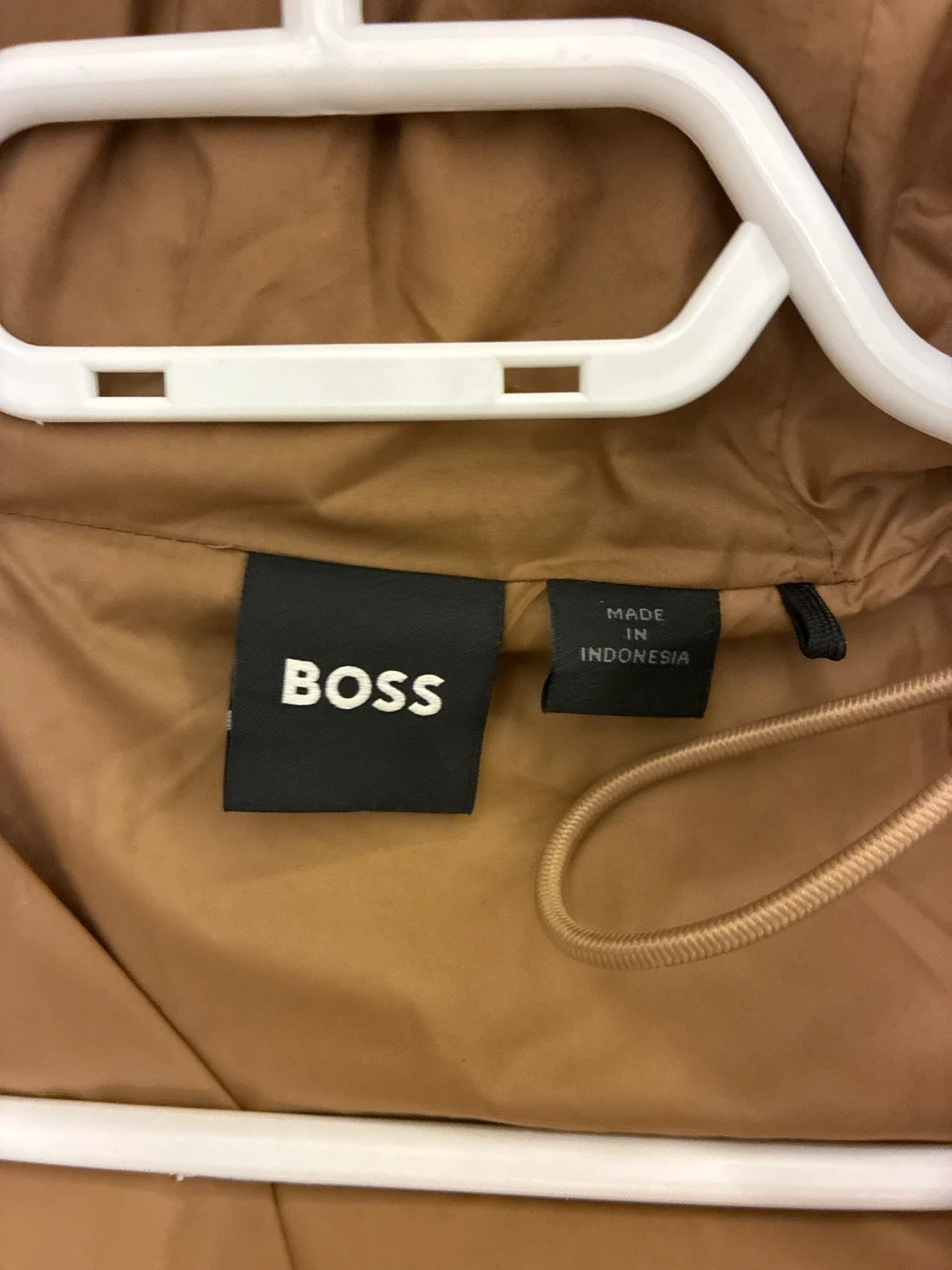 60Selling a stylish BOSS hooded jacket in a nice brown colour. It's lightweight and perfect for layering. The jacket features a zipper closure and sporty stripes across the chest. Made in Indonesia.