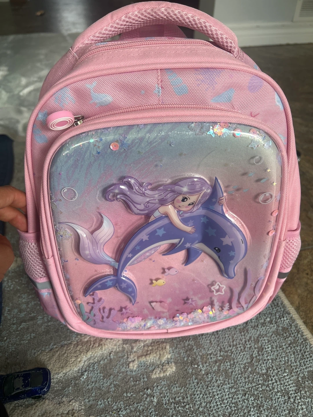 60A cute pink backpack for kids! It features a mermaid riding a dolphin design. Perfect for school or outings