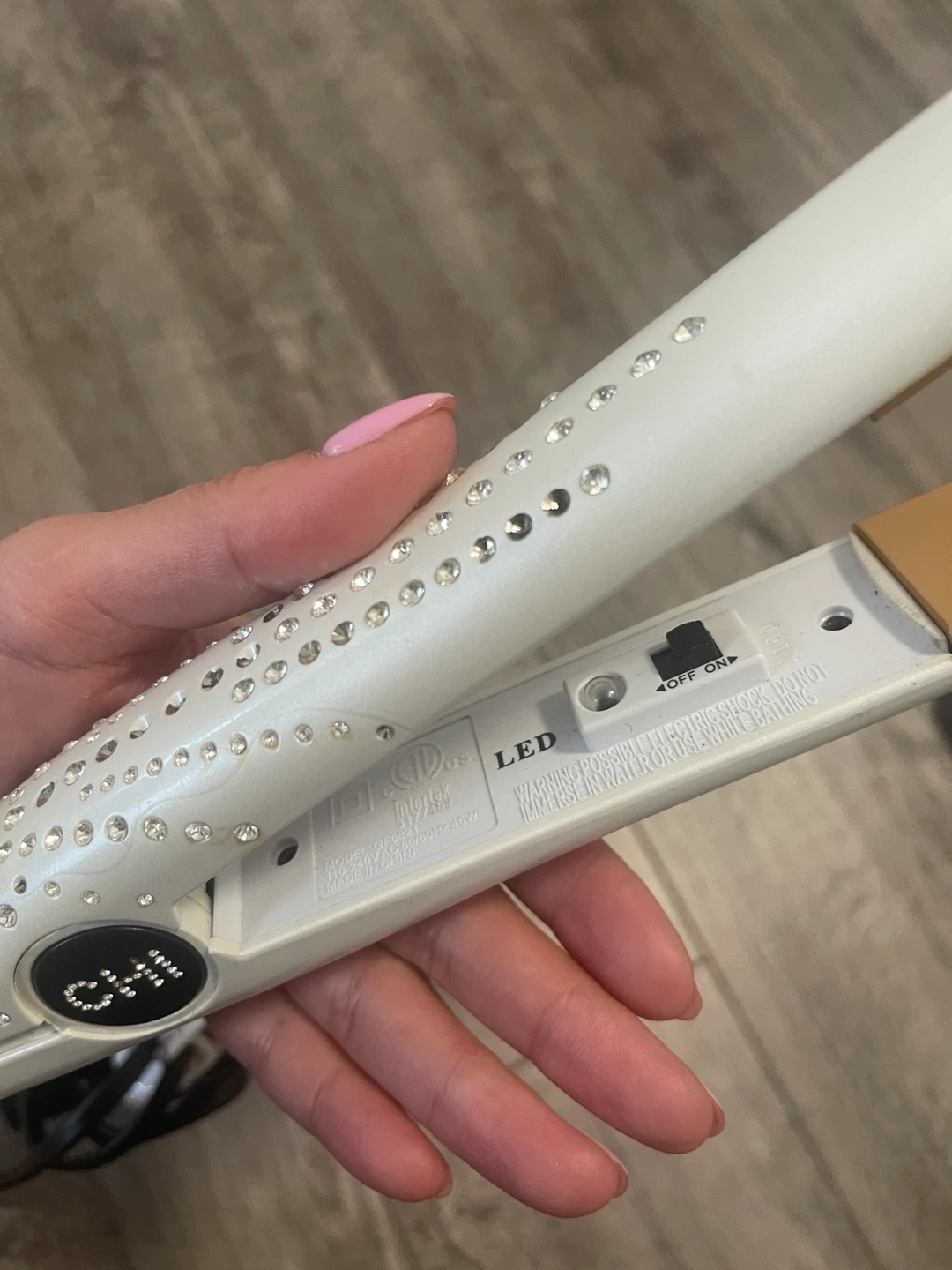 Selling a CHI flat iron in white, decorated with rhinestones! It's in great condition and ready to help you style your hair. Features an LED indicator and an on/off switch for easy use