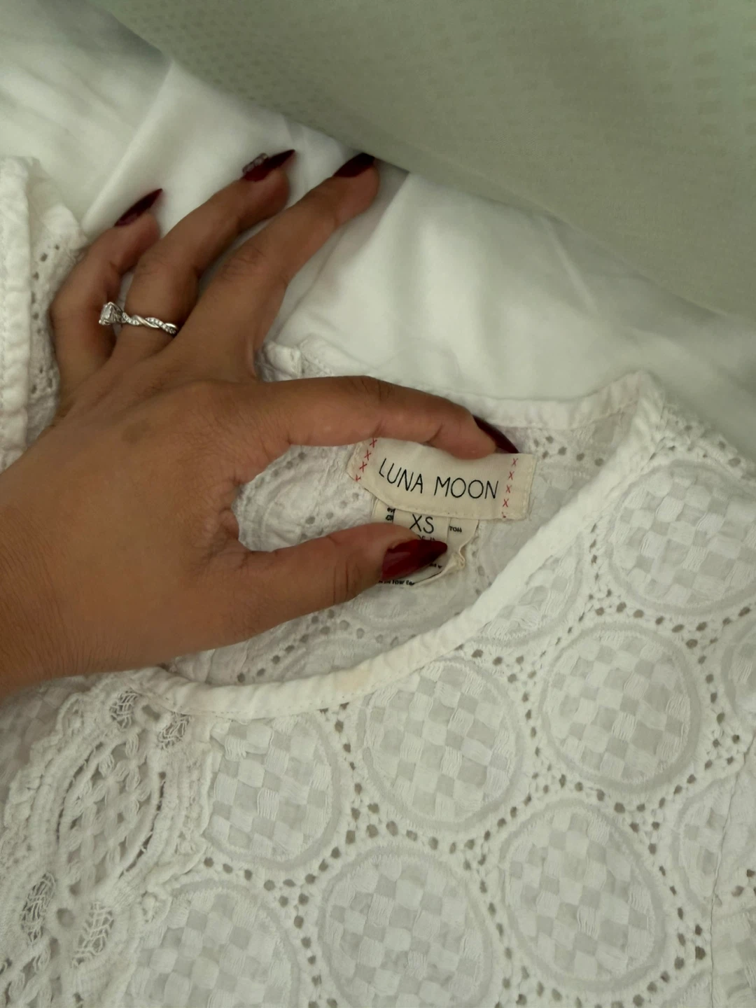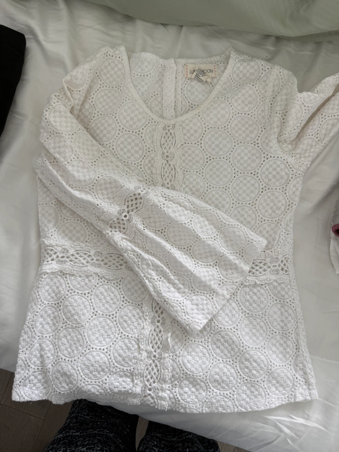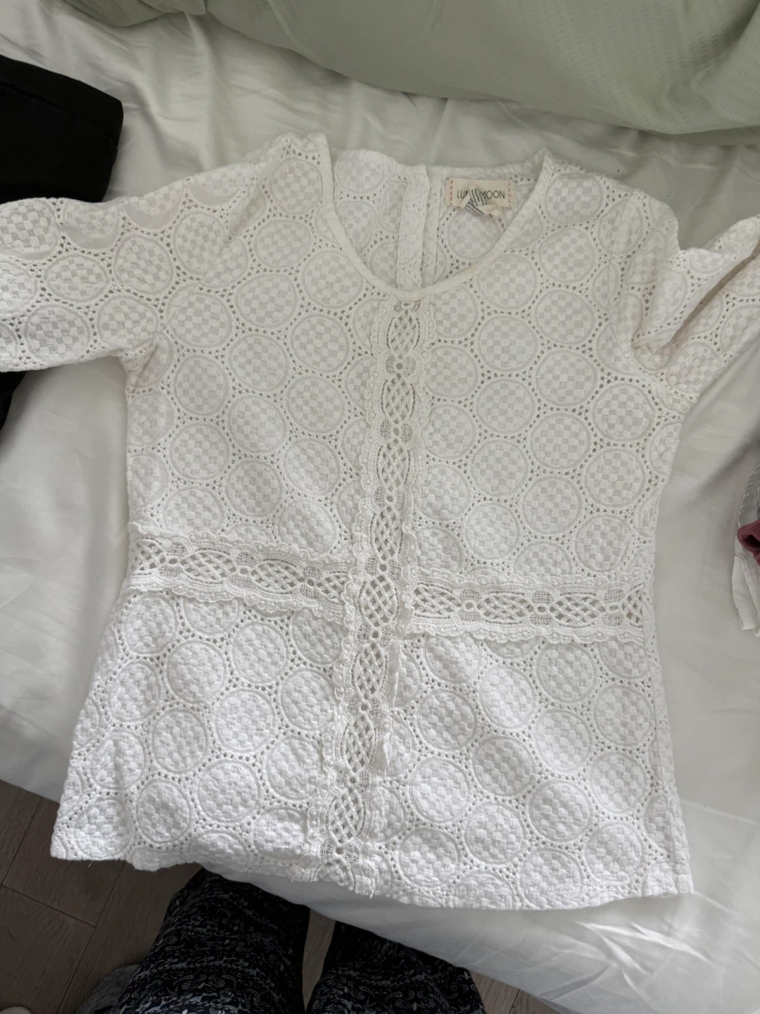 Selling a lovely white lace blouse from Luna Moon! It's a size XS and in great condition. The lace detailing is really beautiful and adds a touch of elegance to any outfit