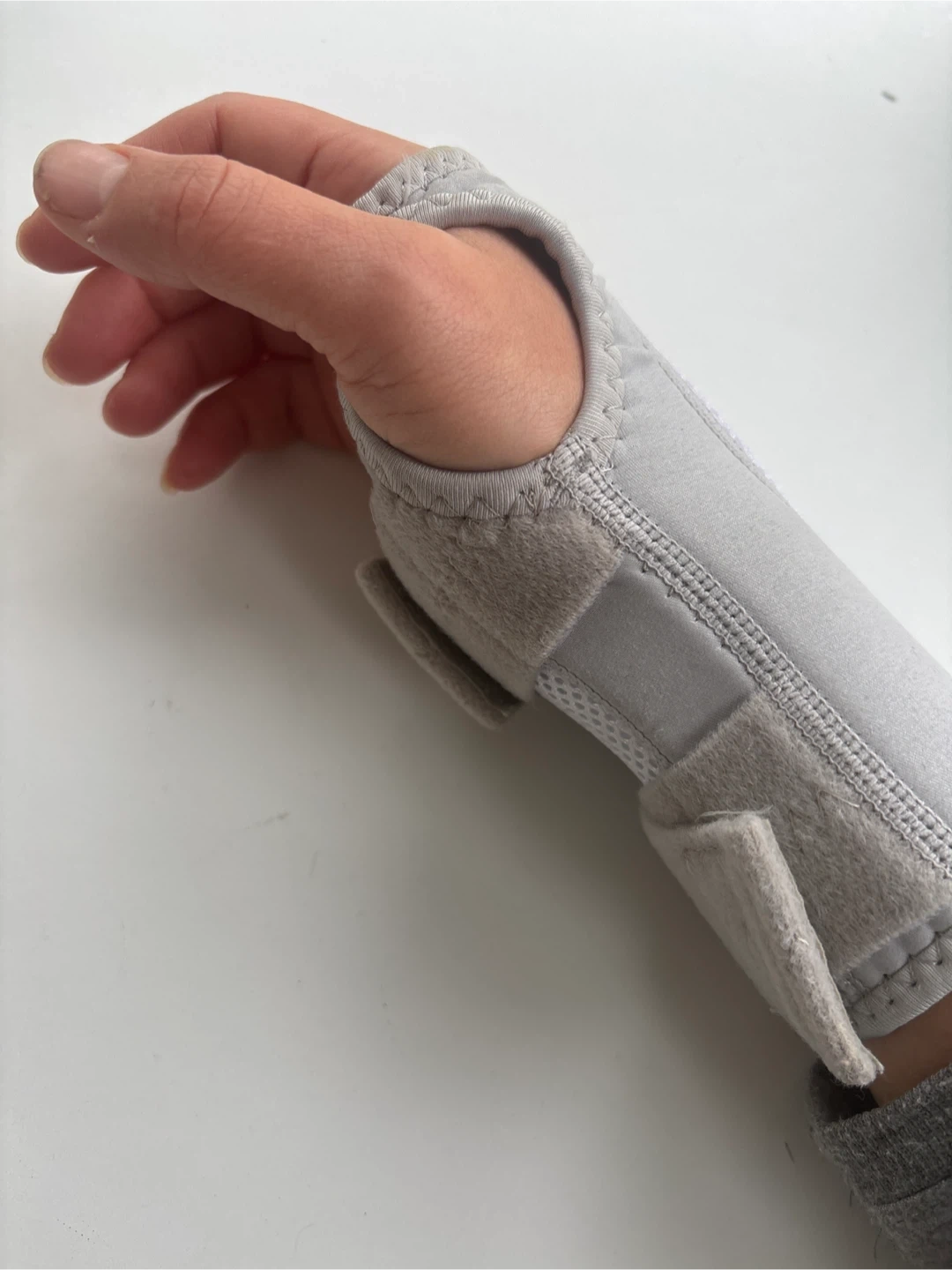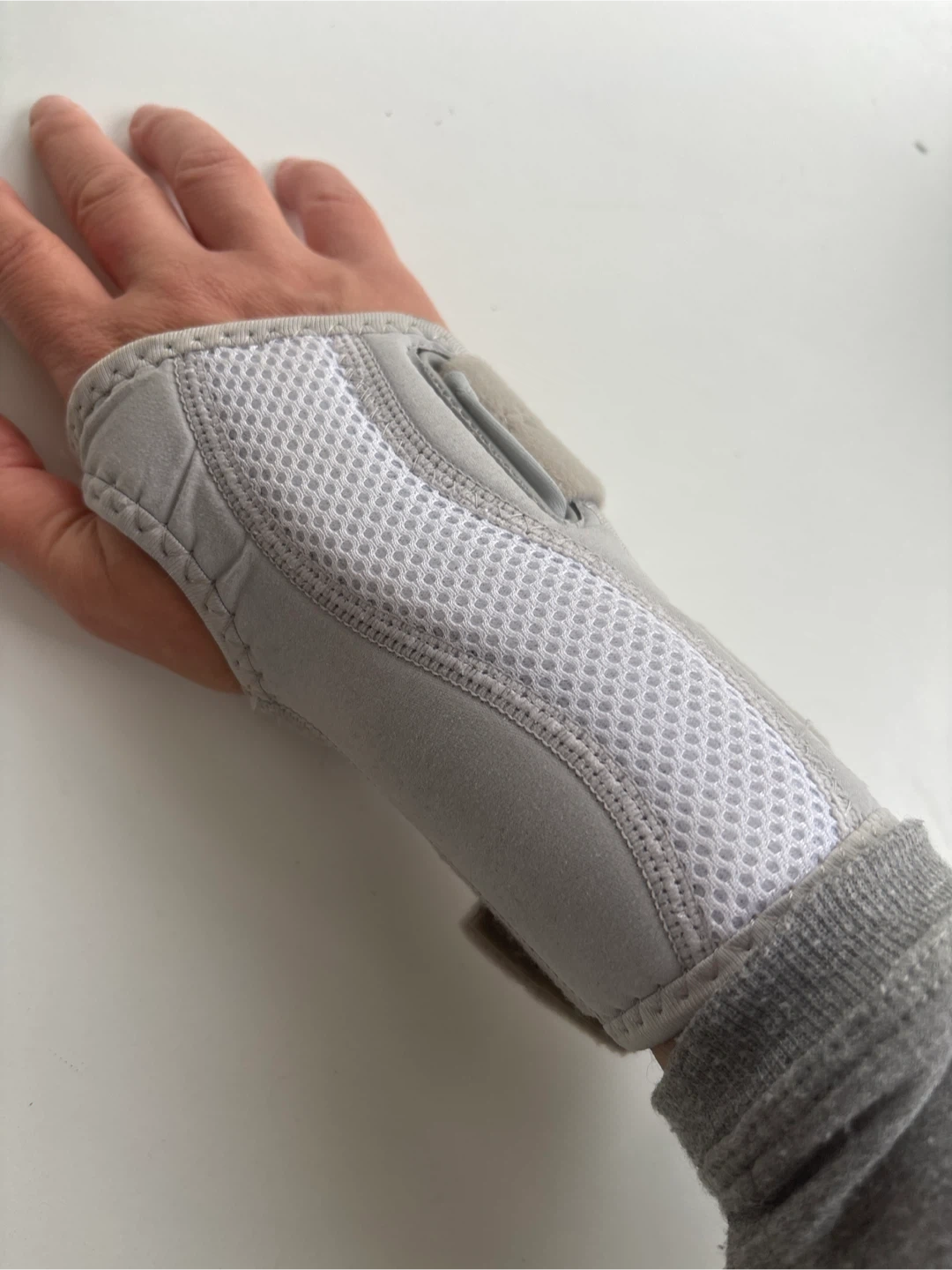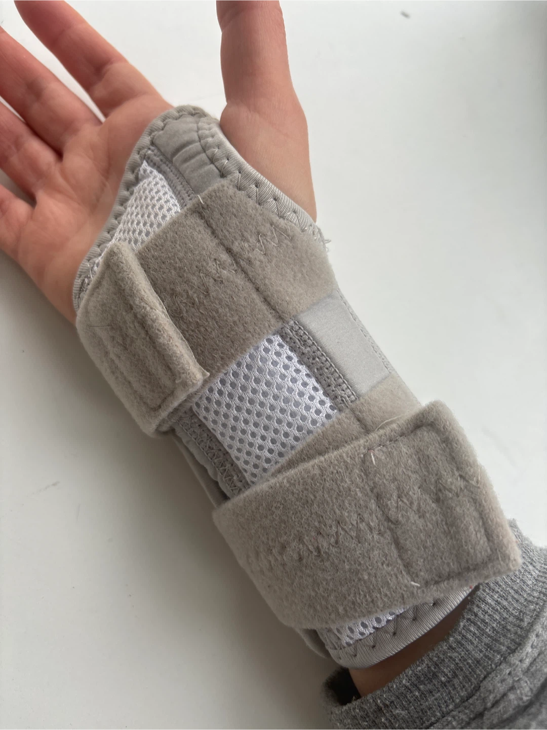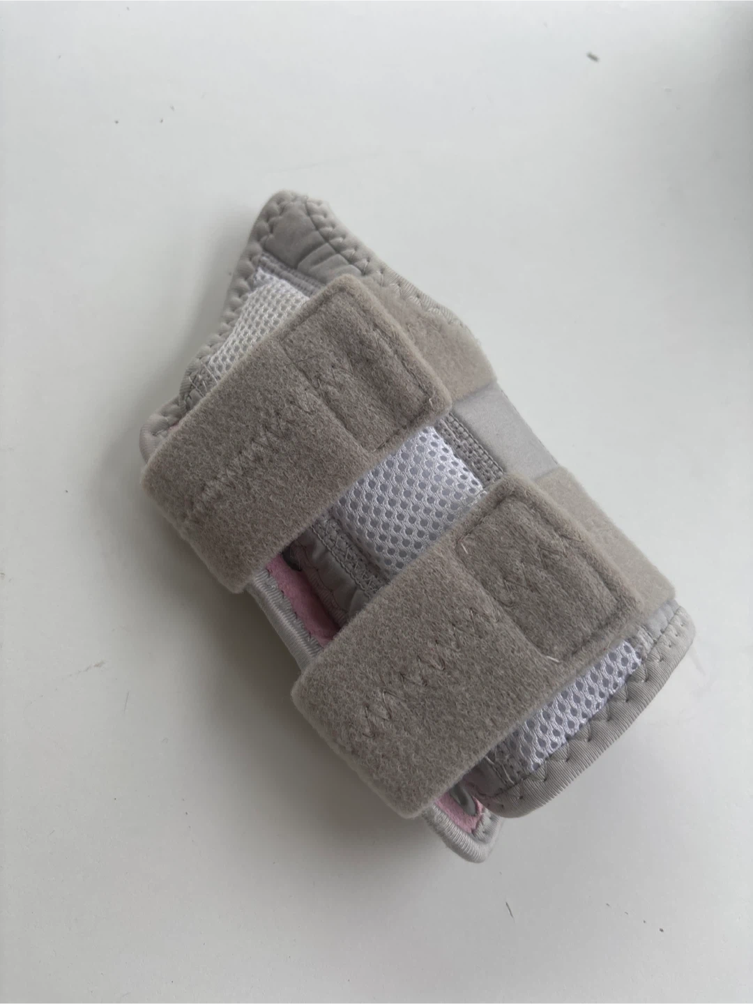 Selling a wrist brace support. It's in good condition and is a light grey colour. It has adjustable straps for a comfortable fit.