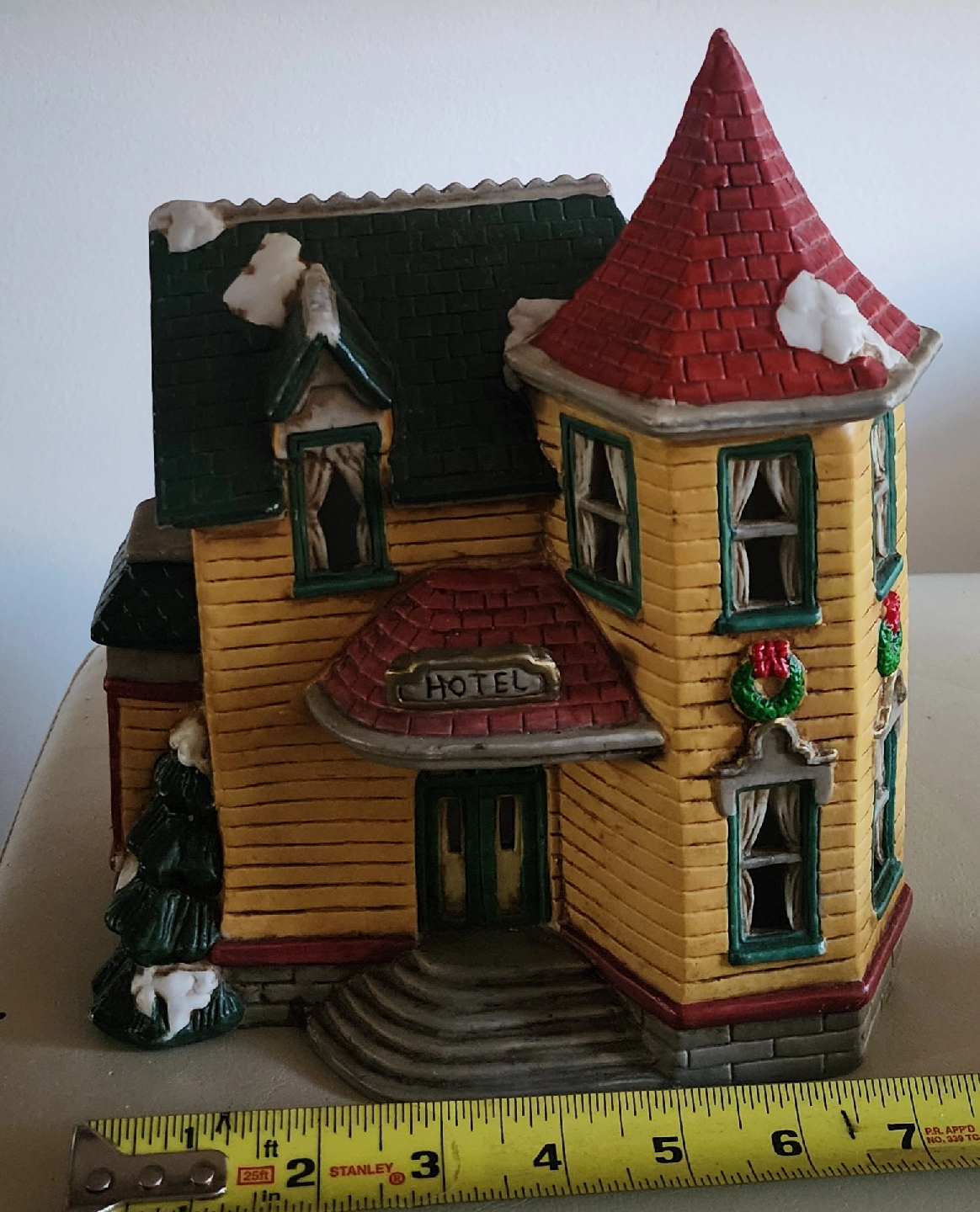 A cute Lemax Hotel lighted building figurine, perfect for adding a touch of charm to your home decor! It features a yellow exterior with a red roof and green accents. The building is in great condition and ready to be displayed