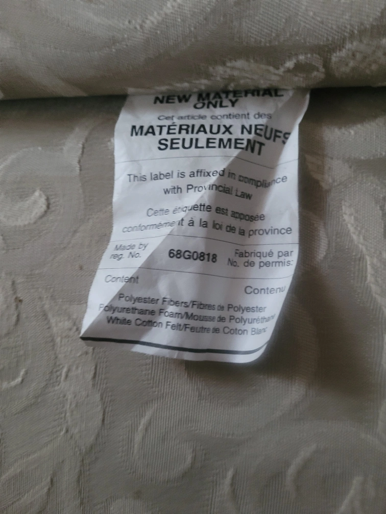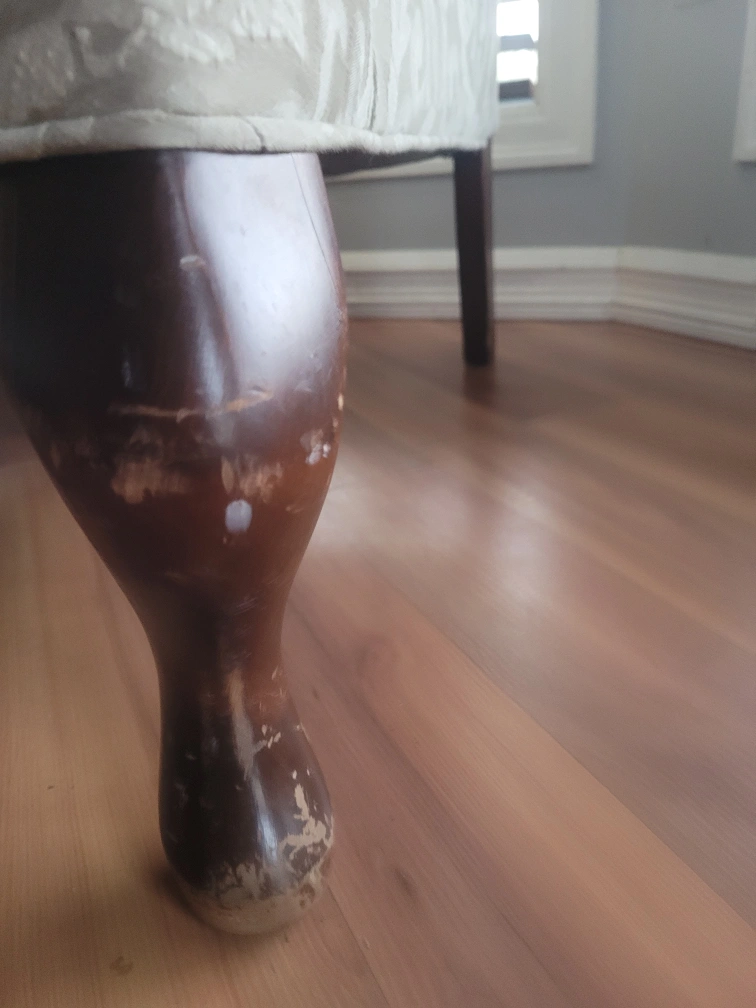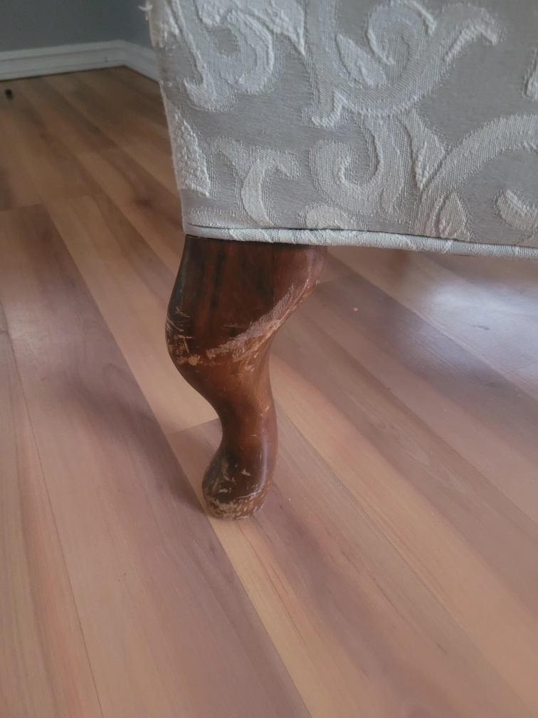 Wingback chair with a beige patterned fabric. The legs show some wear and tear, as seen in the pictures. The material content includes polyester fibers, polyurethane foam, and white cotton felt.