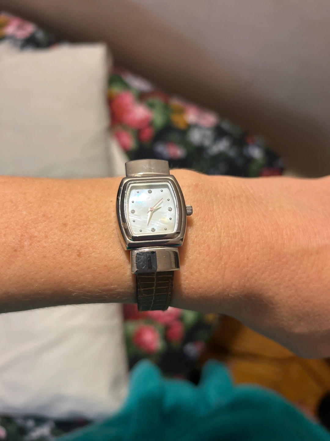 Selling a vintage Mary Kay consultant watch. The face js mother of pearl and the reversible band is leather. one side black and the other a light brown. The casing is silver toned.