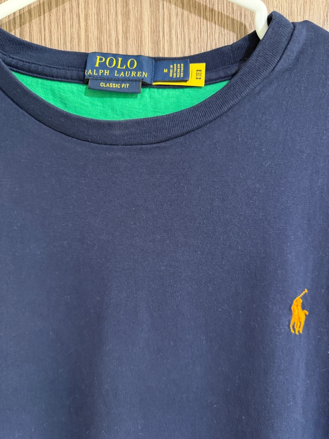 This is a Polo Ralph Lauren colour block t-shirt in size medium. The shirt features a navy blue body with yellow and orange sleeves, and a green back. It's in great condition and ready for a new home!