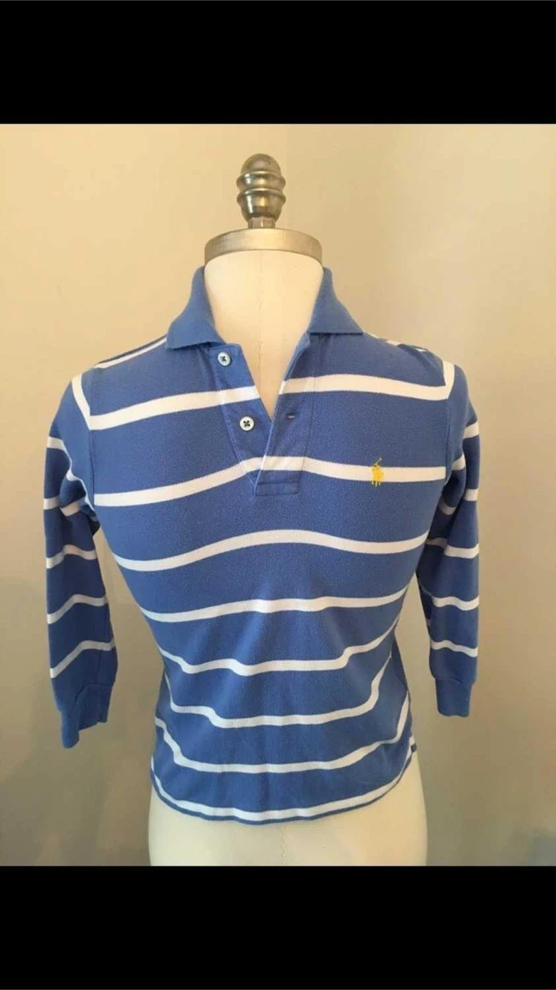 Polo by Ralph Lauren long sleeve polo shirt in size 6. It's a light blue with white stripes and the classic yellow Polo logo. Great for a casual look!