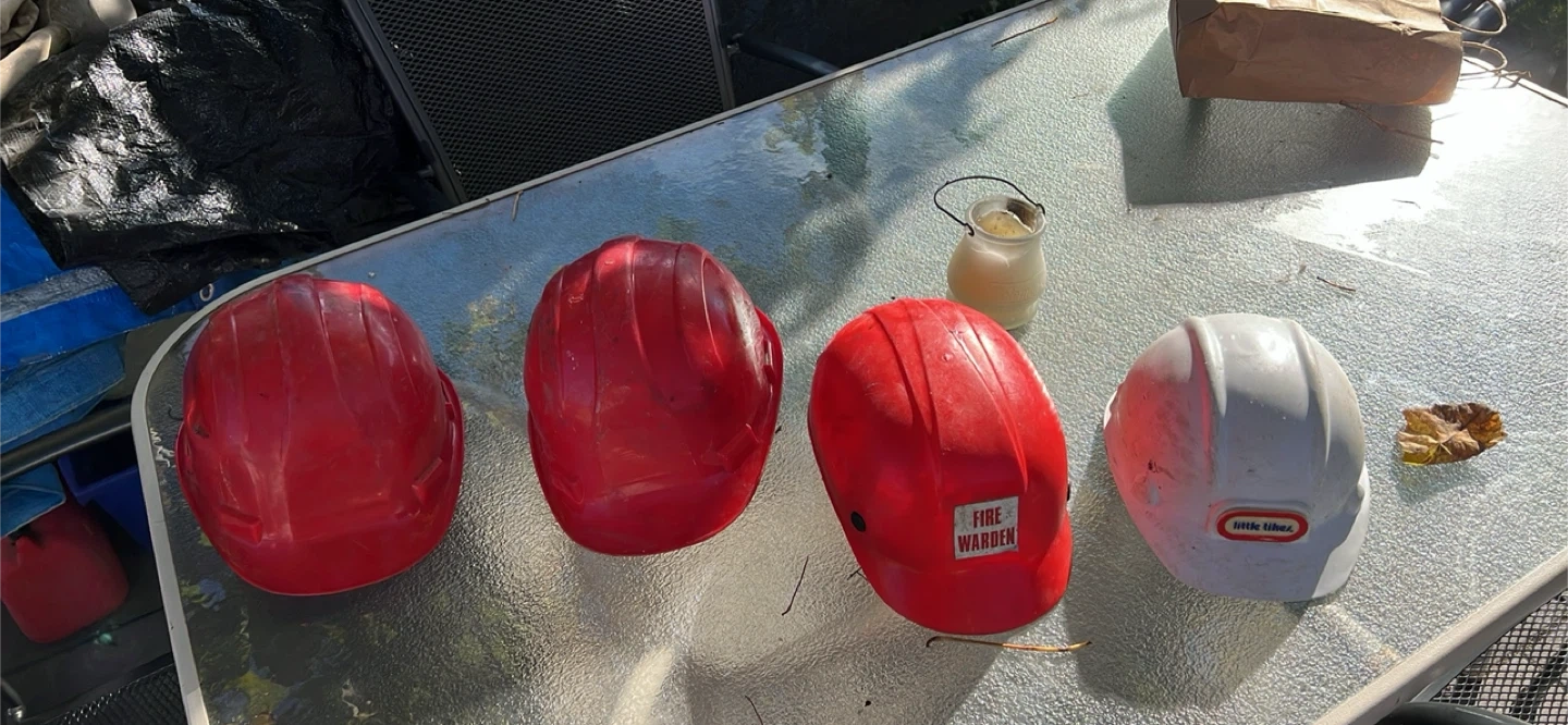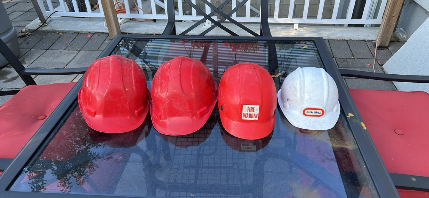 10Selling a Little Tikes hard hat and three red hard hats. They're in good condition and ready for some fun or work!