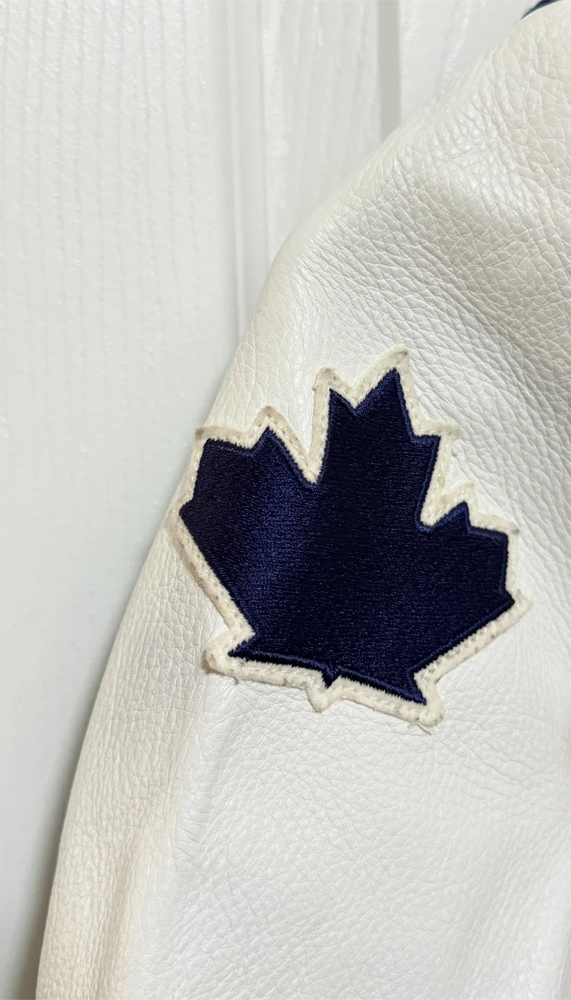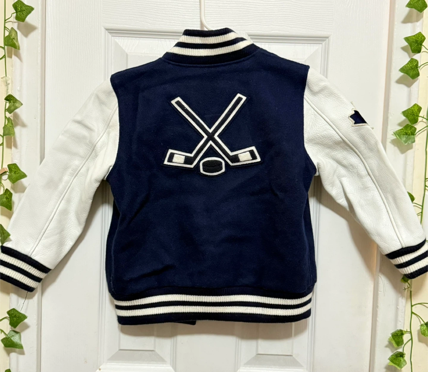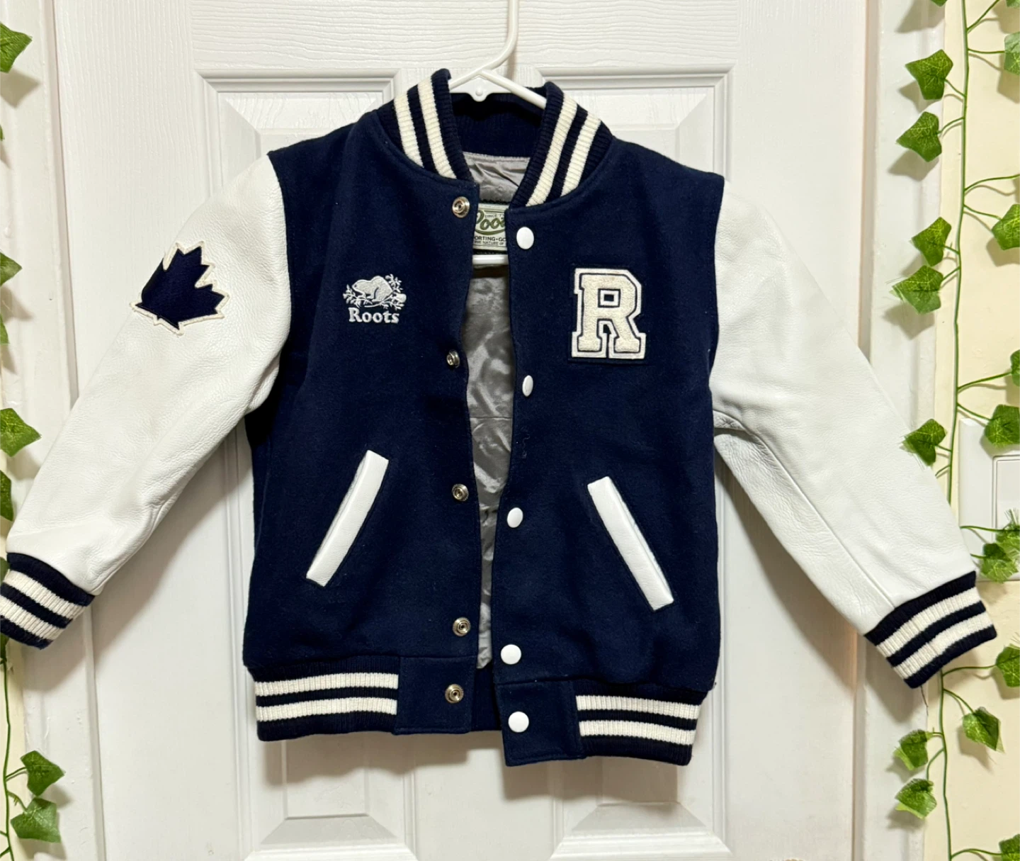 Selling a cute Roots kids varsity jacket! It's navy blue with white leather sleeves and a big 'R' on the front. Perfect for keeping your little one warm and stylish.