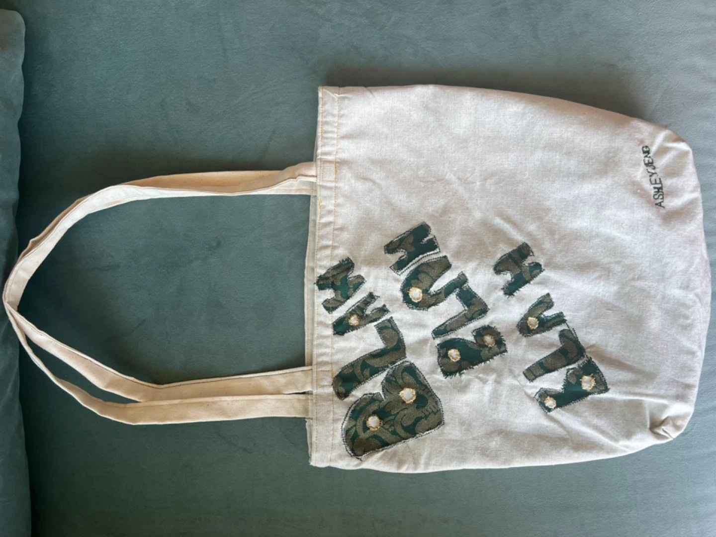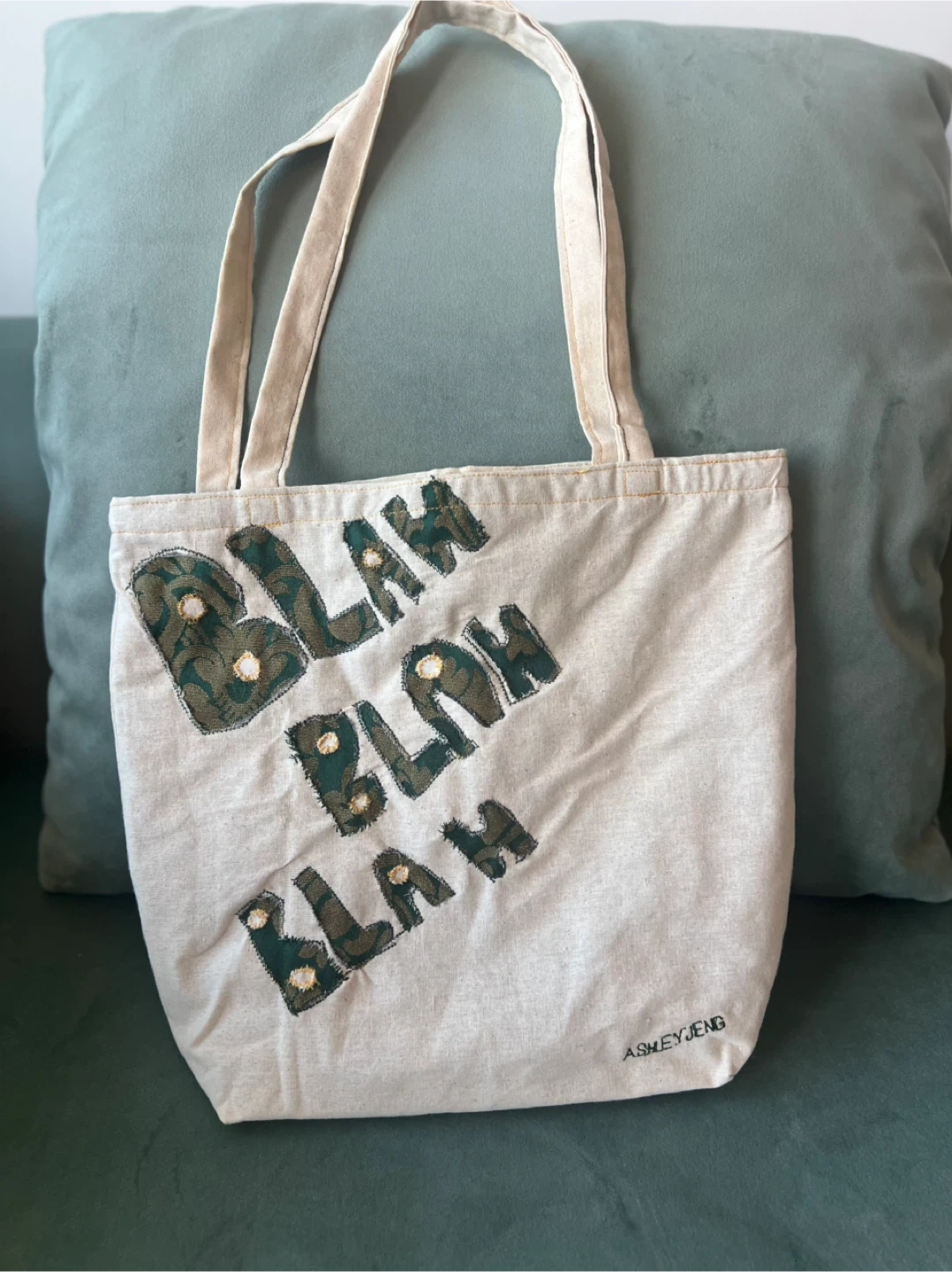 212A cute small Ashley J Eng tote bag with "Blah Blah Blah" designed on it. It can fit a good amount of items. It's handmade with love and ready for a new home!