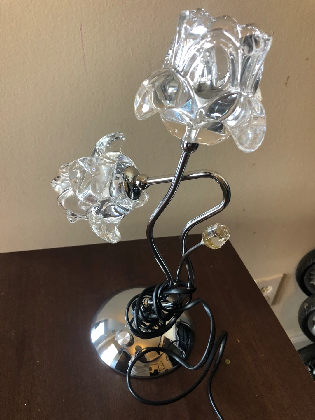 Here's a charming flower table lamp! It features clear, flower-shaped shades and a sleek, chrome-finished base. This lamp would add a touch of elegance to any room