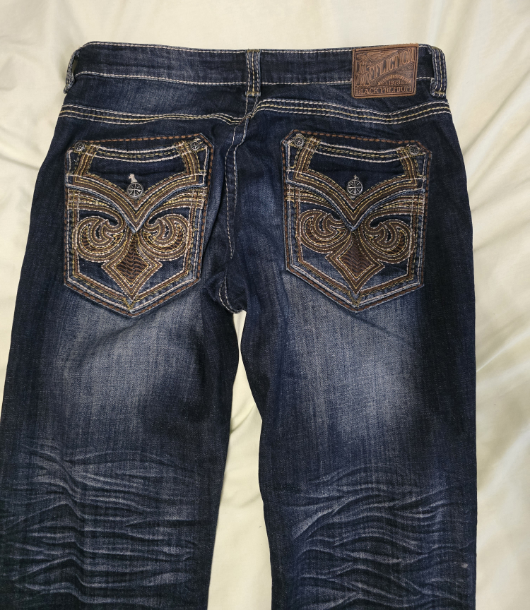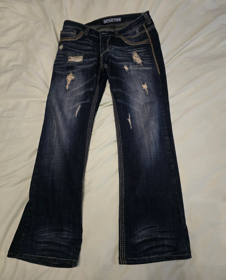 Selling a pair of Affliction jeans in a dark wash. They feature a distressed look with detailed stitching on the back pockets. Great for a stylish, edgy look!