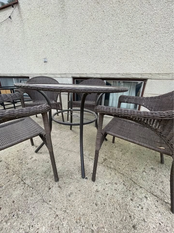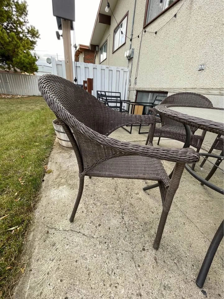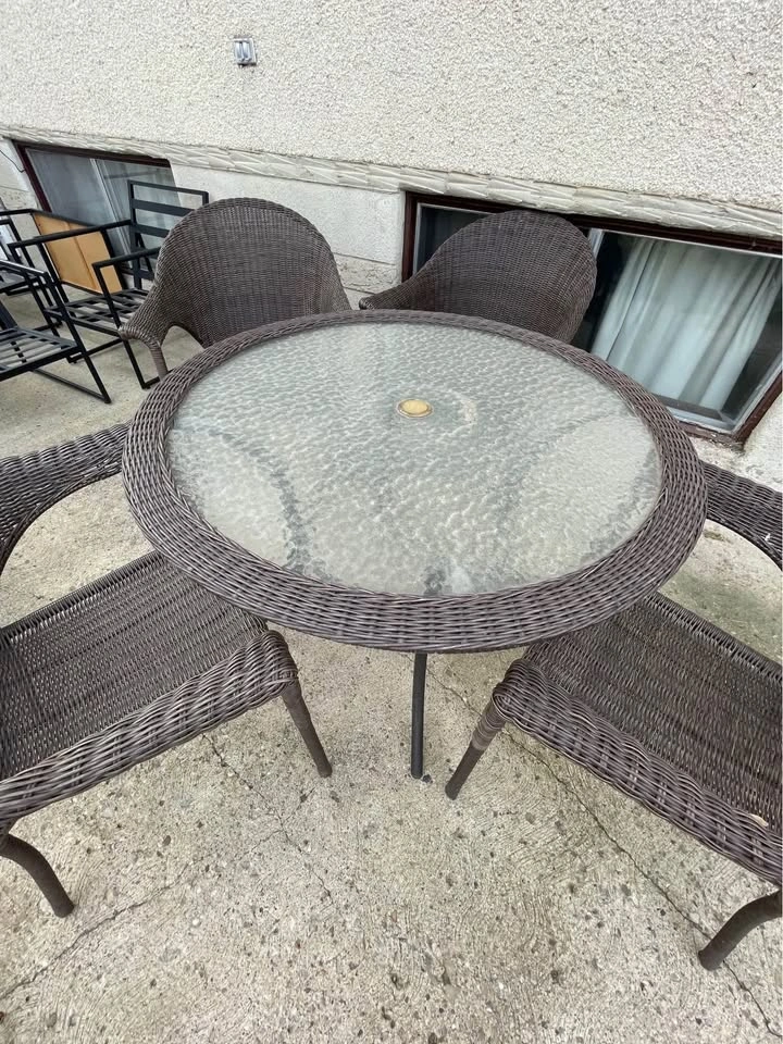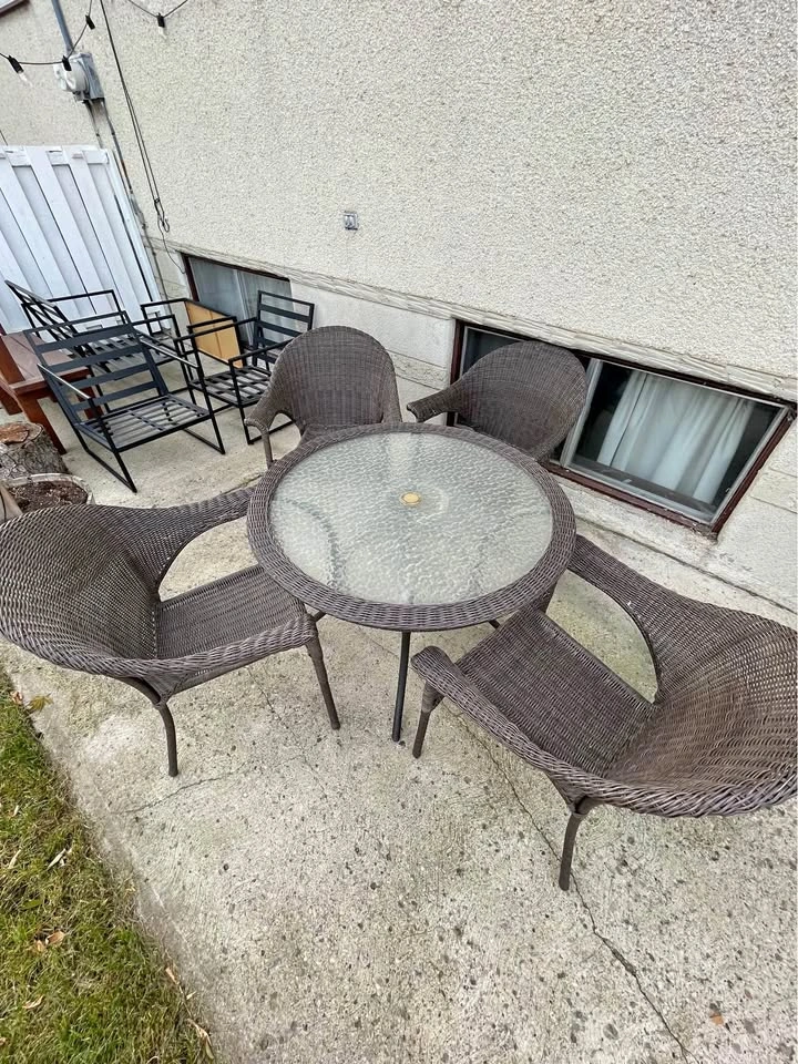 Patio table and chairs. Table top is tempered glass with a spot for an umbrella if desired. Four chairs come with beige seat cushions. All in great shape! A few years old but rarely used. Stored inside over winter. Moving and downsizing.