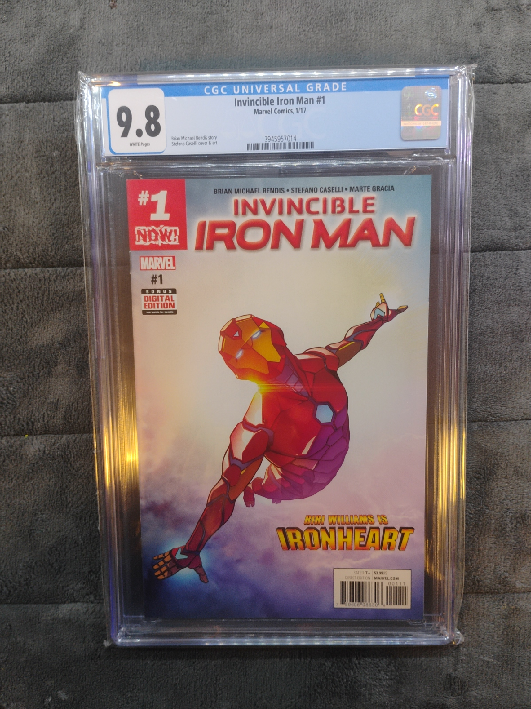Selling a graded copy of Invincible Iron Man #1, certified by CGC with a grade of 9.8. This comic features Brian Michael Bendis' story and Stefano Caselli's cover art. It also includes a bonus digital edition. A great addition for any Marvel collector!