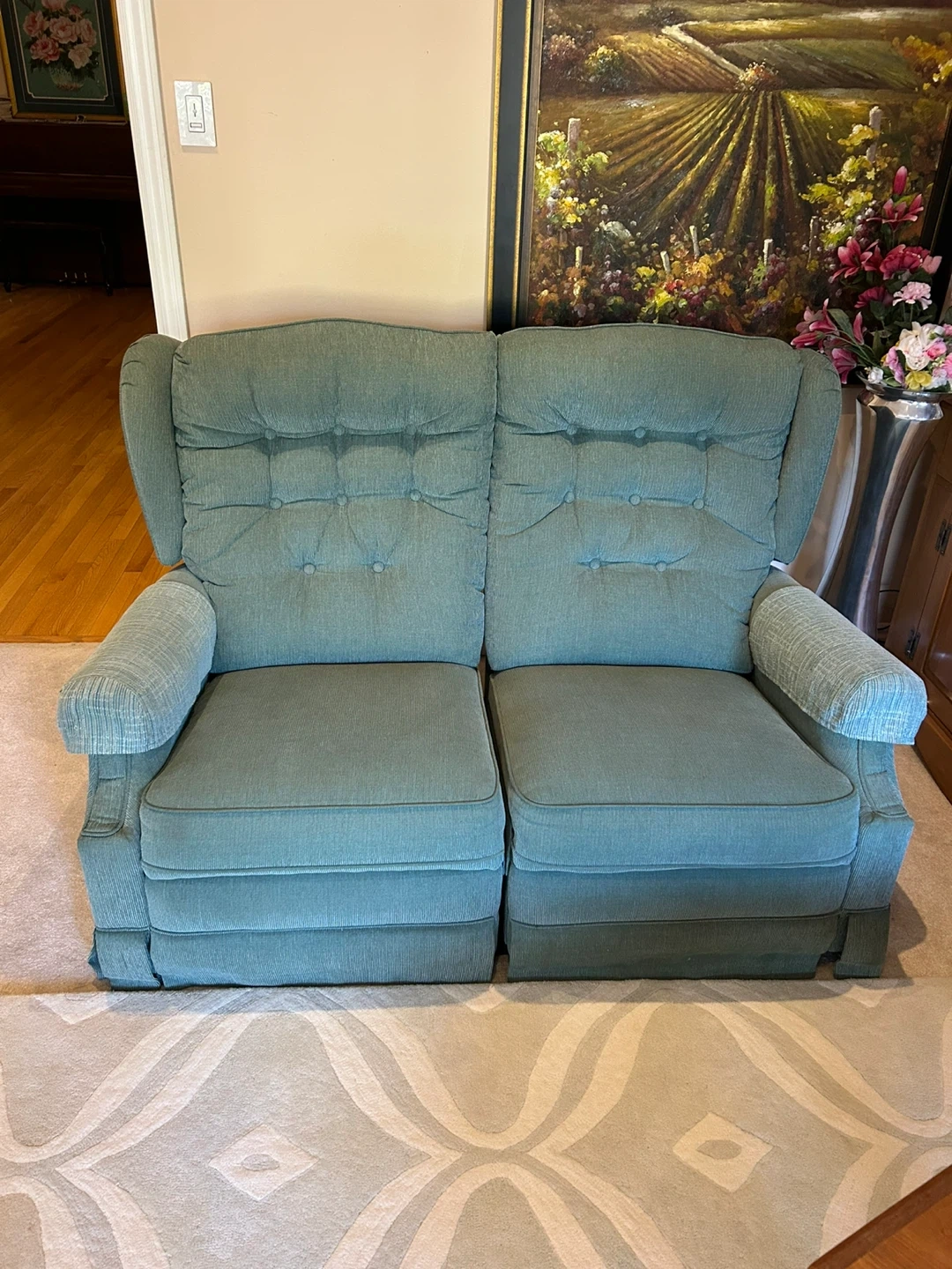 This is a comfortable loveseat recliner in a lovely green color. It appears to be in good condition.