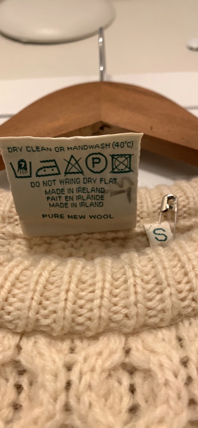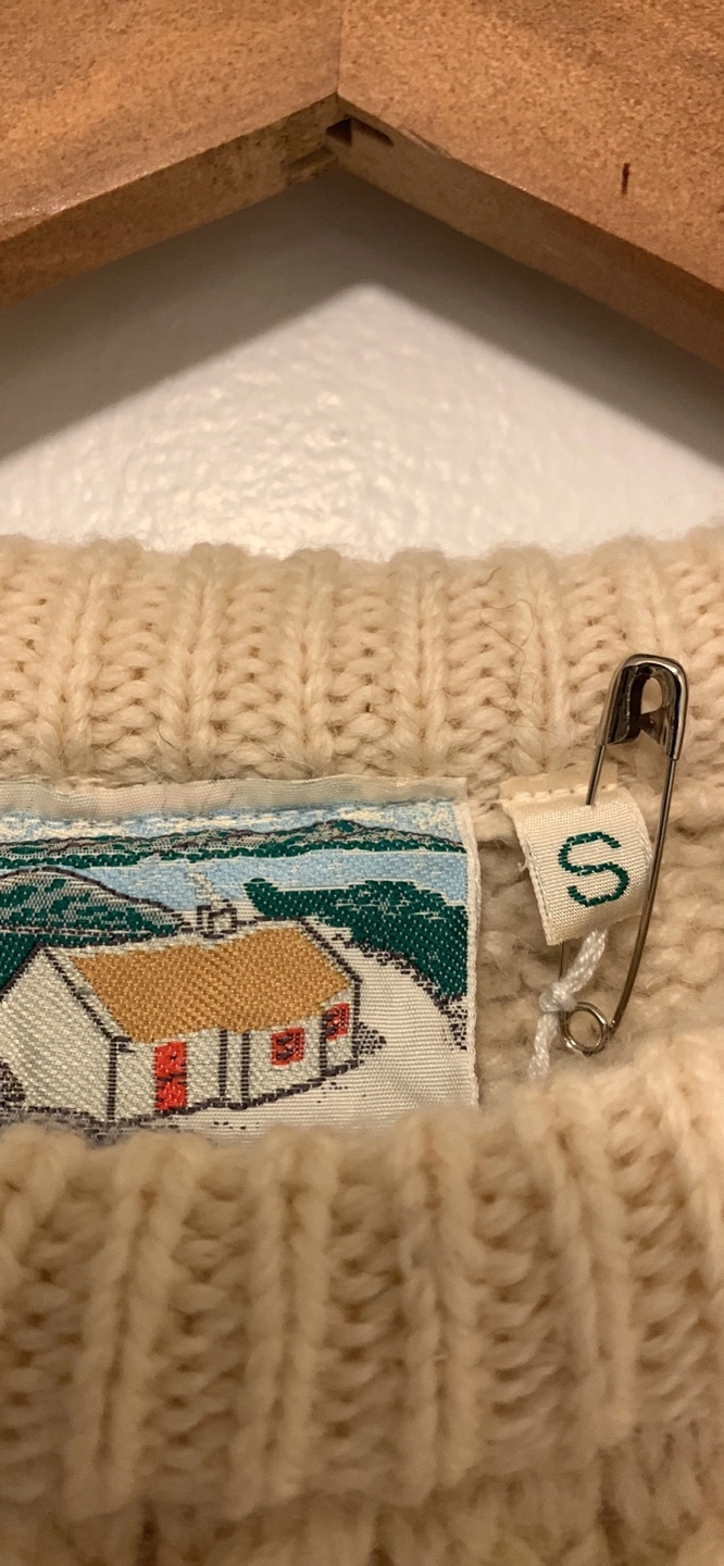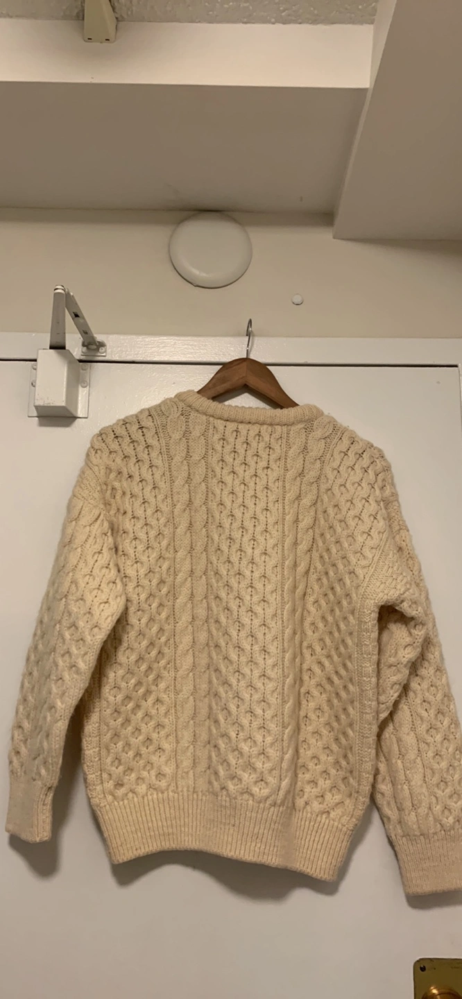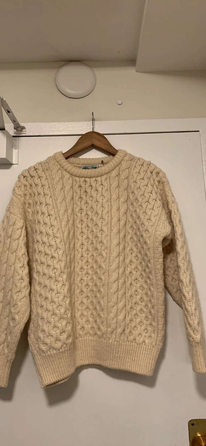 127Cozy and warm, this Irish wool sweater is perfect for chilly days! It's made of pure new wool and features a classic cable knit design. Size is small. Made in Ireland!