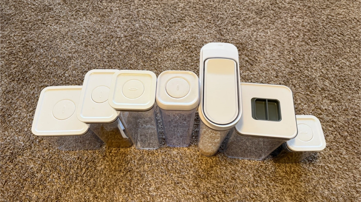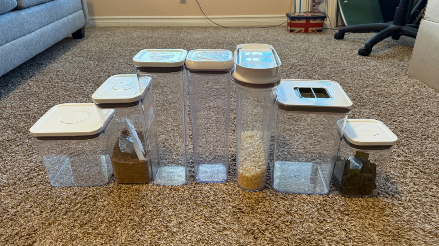 Selling a set of 6 OXO Good Grips POP containers and 1 other air tight container! These are great for keeping your pantry organized and your food fresh. They come in various sizes, perfect for storing everything from cereal to snacks. The containers are clear so you can easily see what's inside, and the lids create an airtight seal.