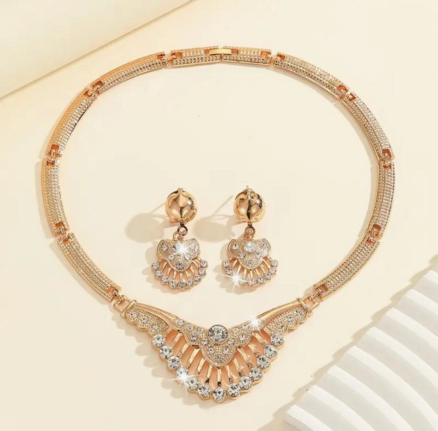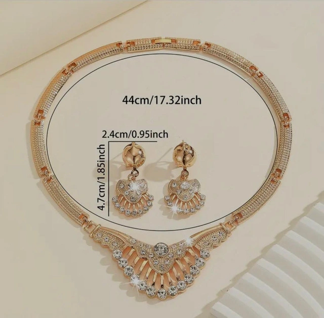 This elegant jewellery set features a stunning necklace and matching earrings, perfect for adding a touch of glamour to any outfit. The set is new and features intricate detailing with sparkling crystals. The necklace measures 44cm in length, and the earrings are 4.7cm long. I'm asking $45 as this set is of high quality and is brand new. If the ad's still up, it's still available!