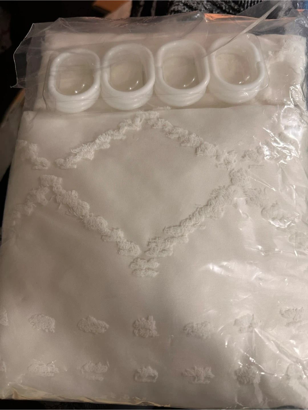 Selling a brand new, still-in-packaging white shower curtain. It features a tufted diamond pattern and comes with the hooks, so it's ready to hang! Perfect for adding a fresh, clean look to your bathroom