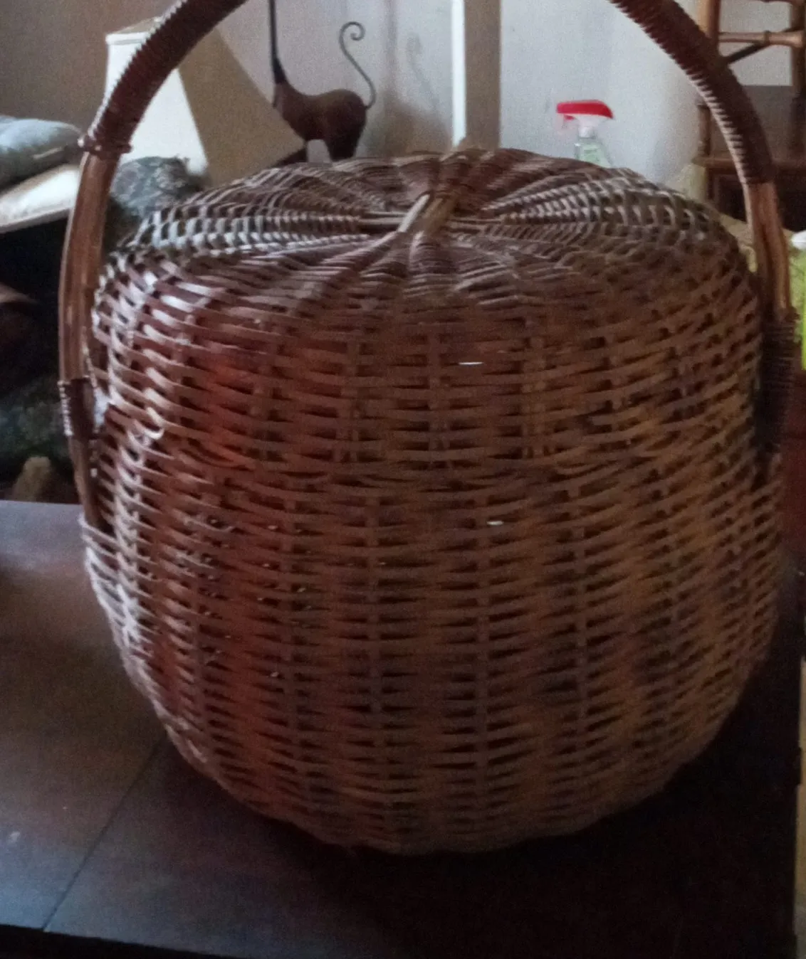 Selling a wicker basket with a handle. It's in good condition and perfect for storage or picnics!