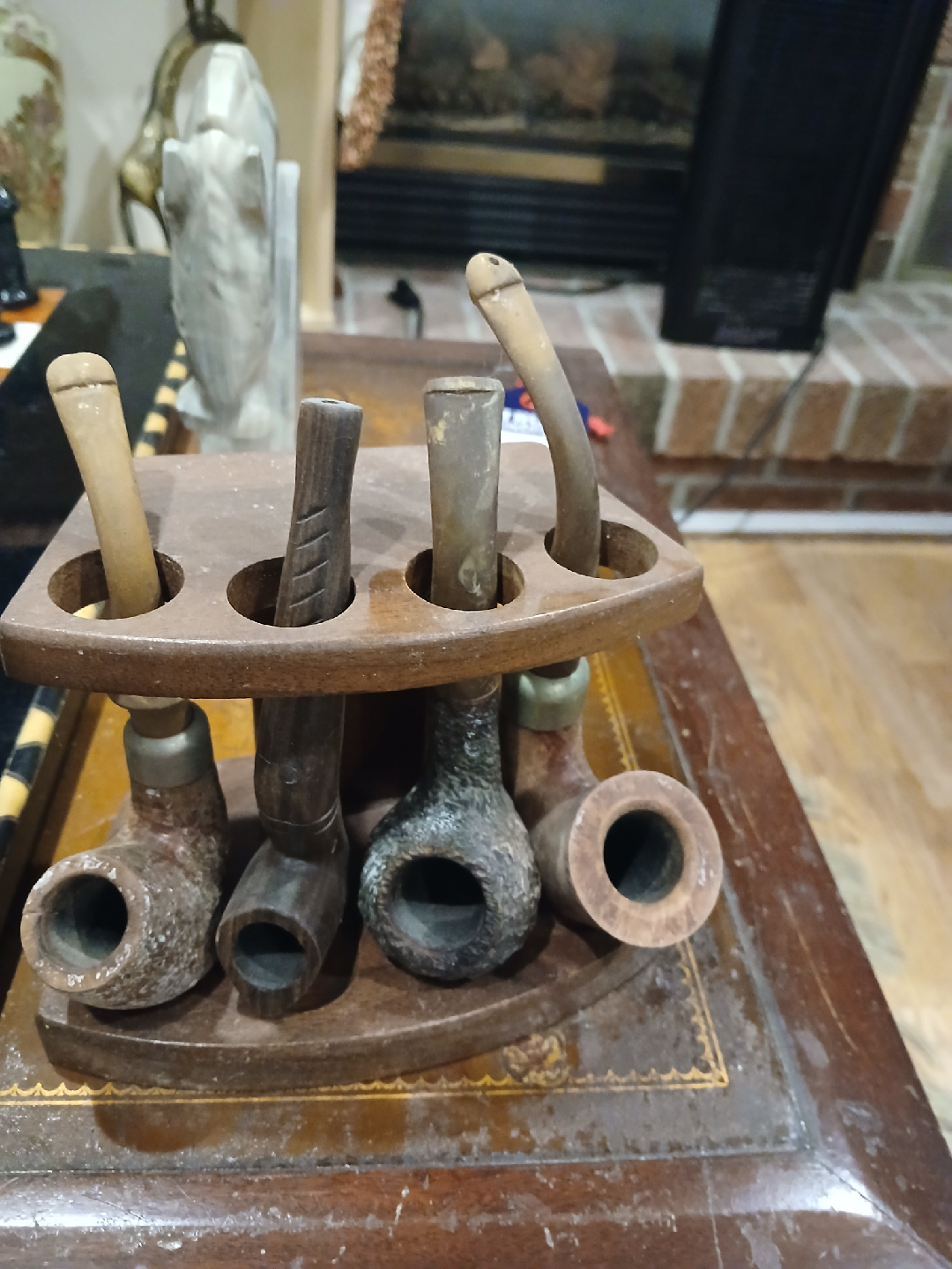 Selling a set of four vintage tobacco pipes with a wooden stand. The pipes have different designs and finishes, showing signs of use and character. Perfect for collectors or anyone looking to add a touch of vintage charm to their space!