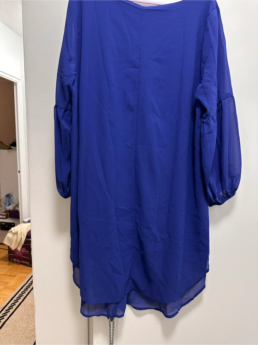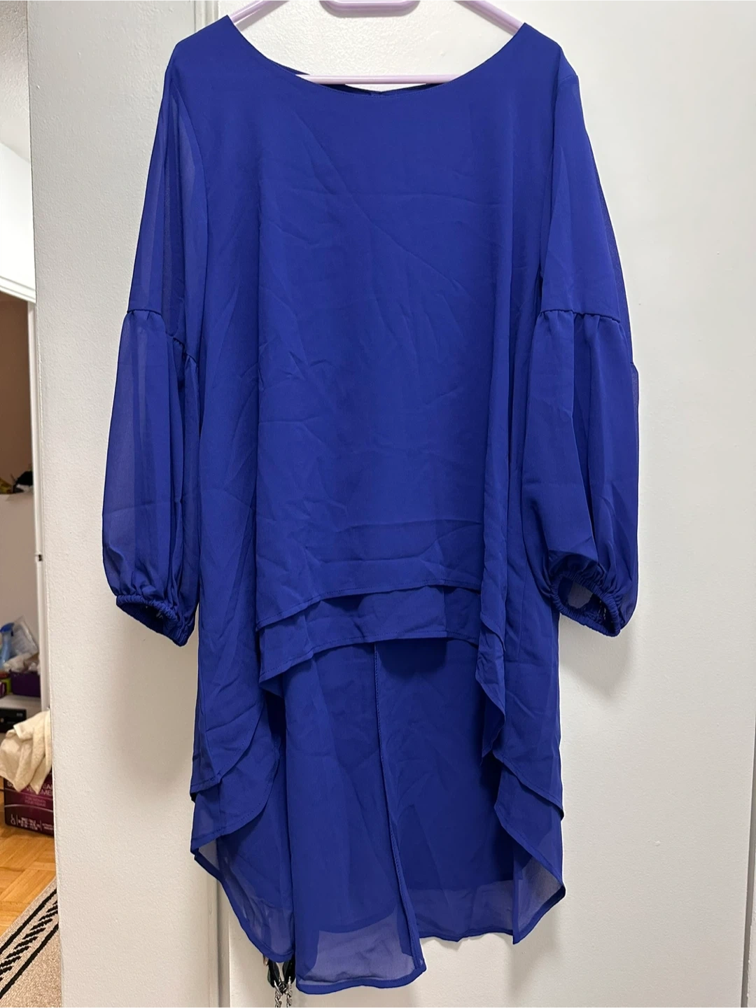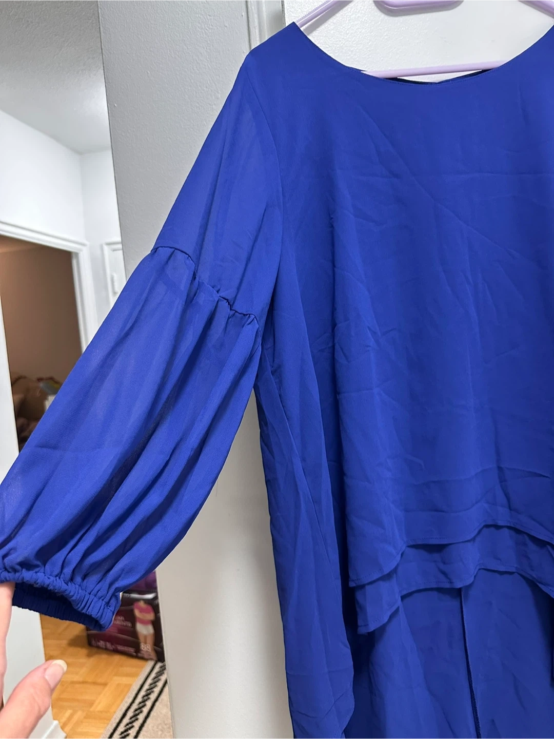 Selling a lovely blue blouse featuring stylish balloon sleeves. It's new (never worn)and ready for a new home! The blouse has a unique layered design; wear with dress pants or nice tights and jewelry for a dressy look, or jeans for a casual and comfortable fit.