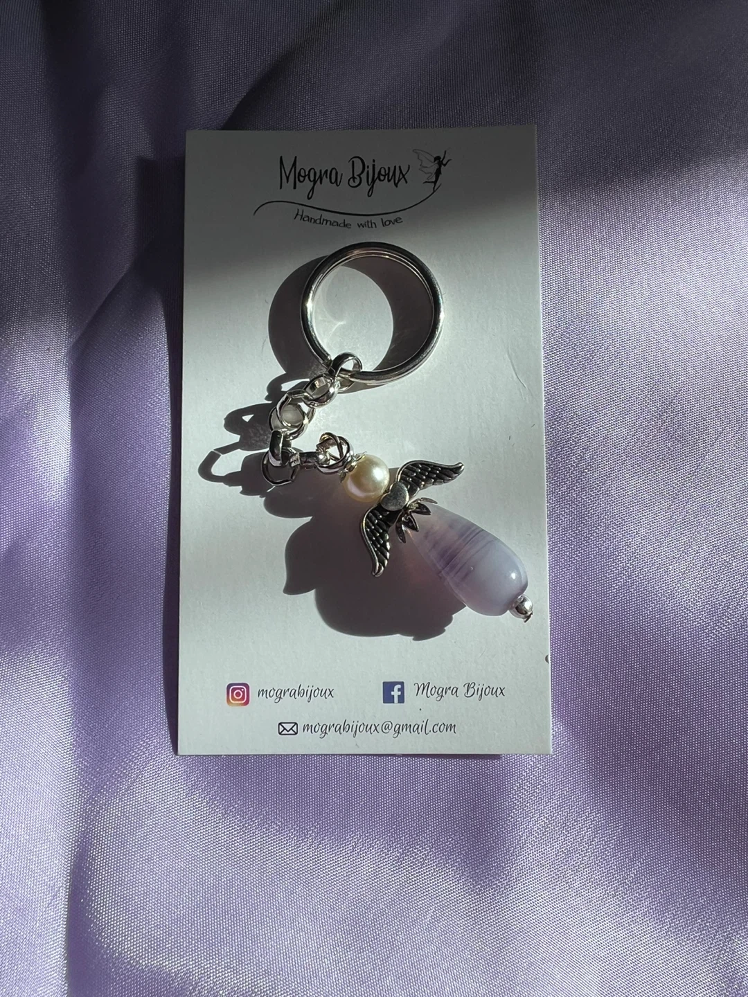 This is a beautiful handmade keychain from Mogra Bijoux! It features a silver angel charm with a pearl accent and a lovely purple stone pendant. It's a unique and charming accessory to add to your keys or bag