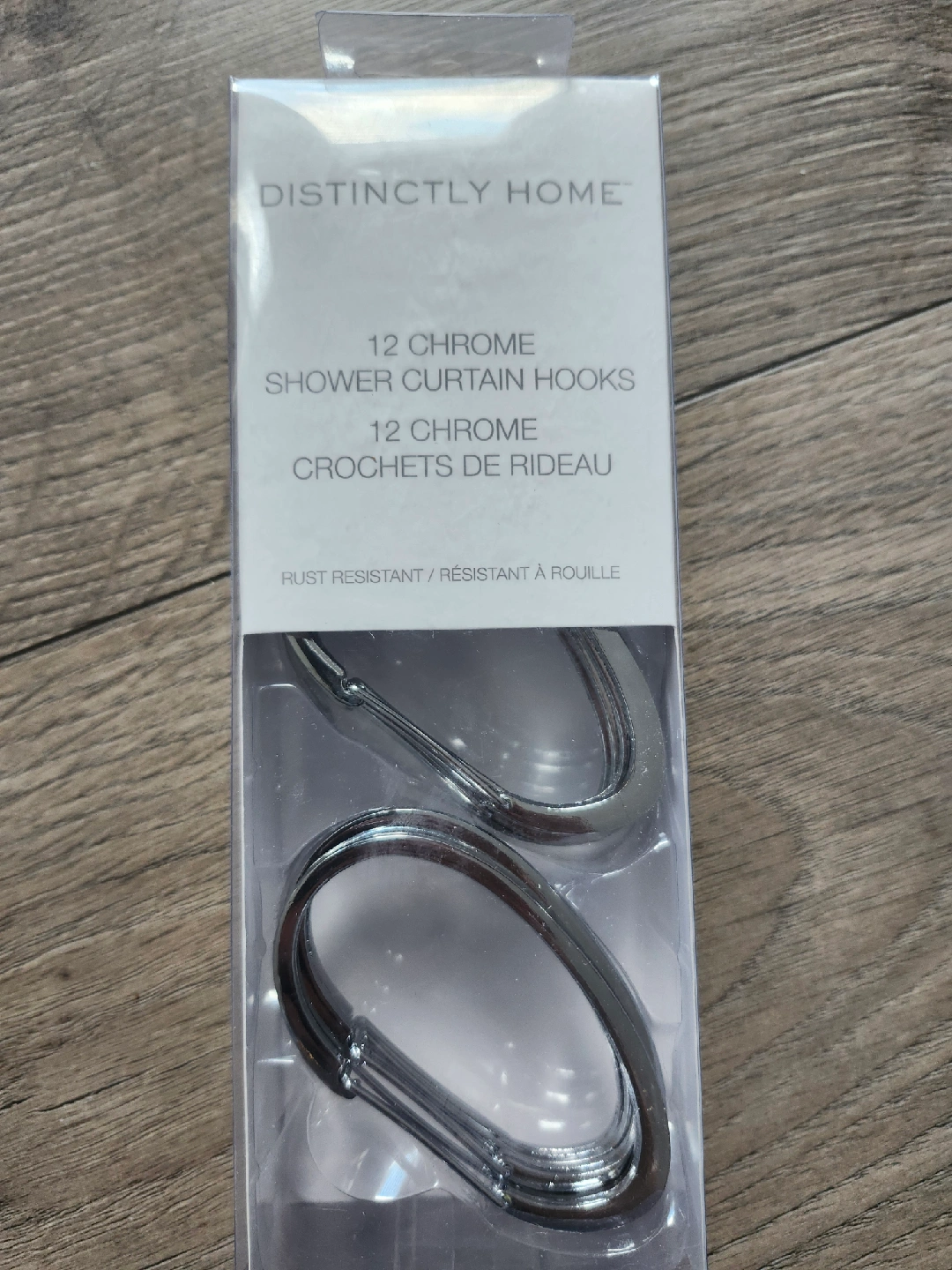 Selling a brand new set of Distinctly Home shower curtain hooks! This set includes 12 chrome shower curtain hooks that are rust resistant. Perfect for any bathroom!