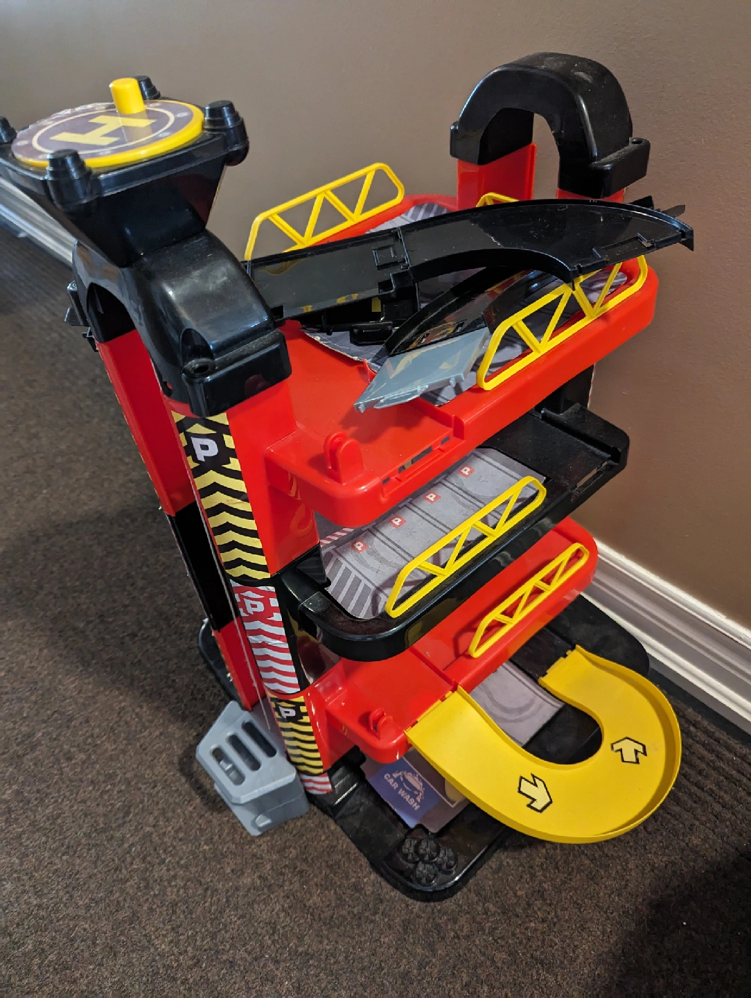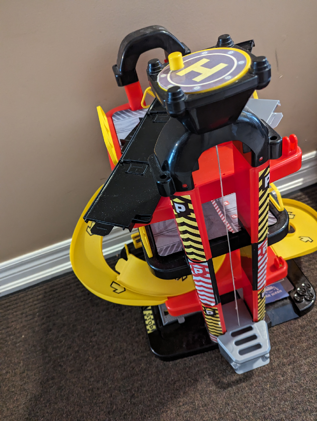 Toy garage for kids, featuring a car wash and helipad. Great for imaginative play and keeping little ones entertained