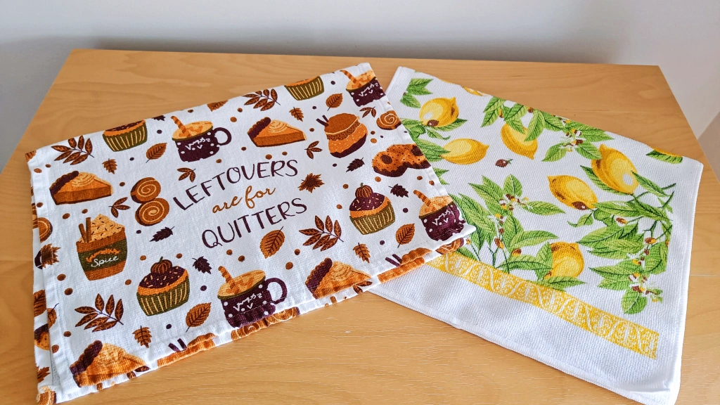 1000+I'm selling a set of two kitchen towels. One has a fun fall theme, and the other has a cute lemon print. They're perfect for adding a bit of cheer to your kitchen!